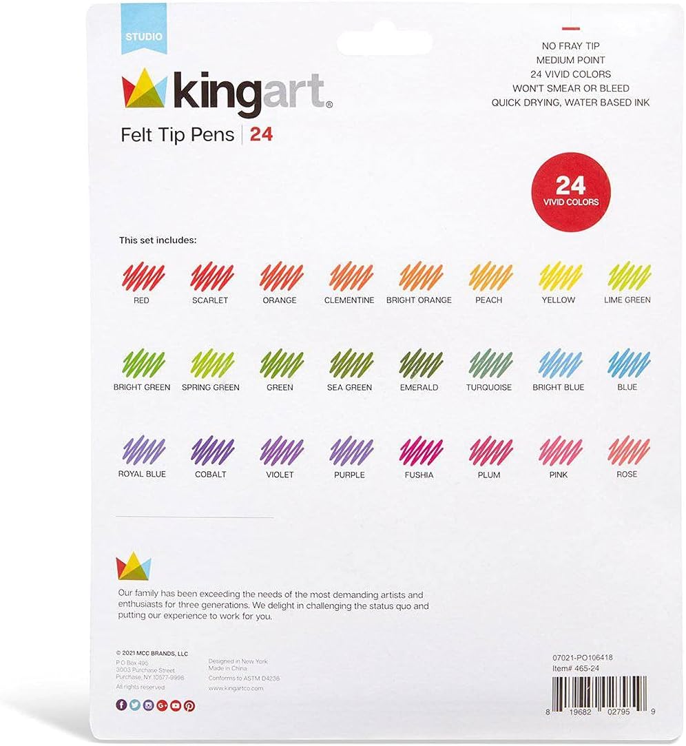KINGART 465-24 FELT TIP PEN MARKERS, Medium Point, Bright Colors, For Writing, Journaling, Note Taking, Set of 24