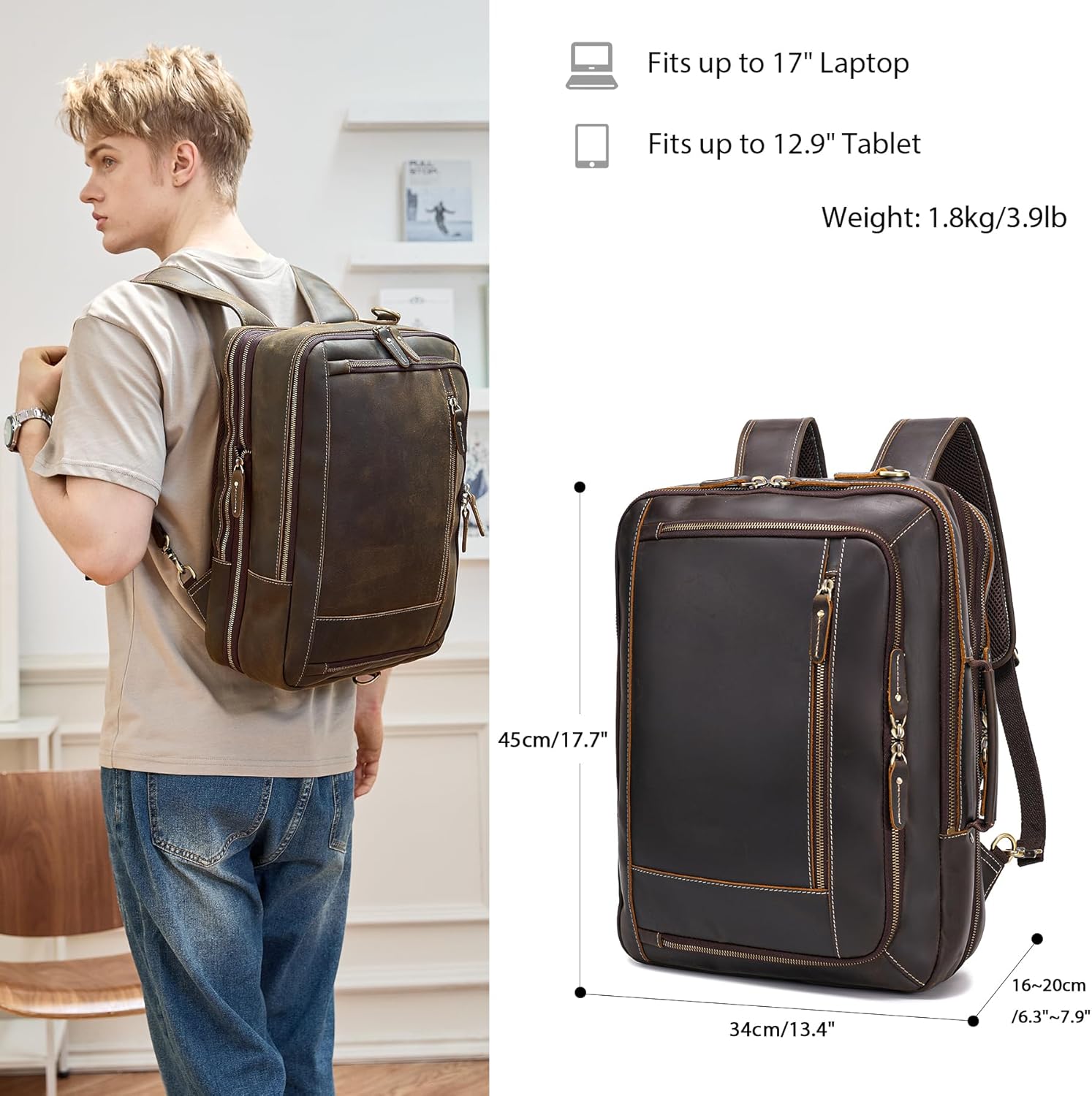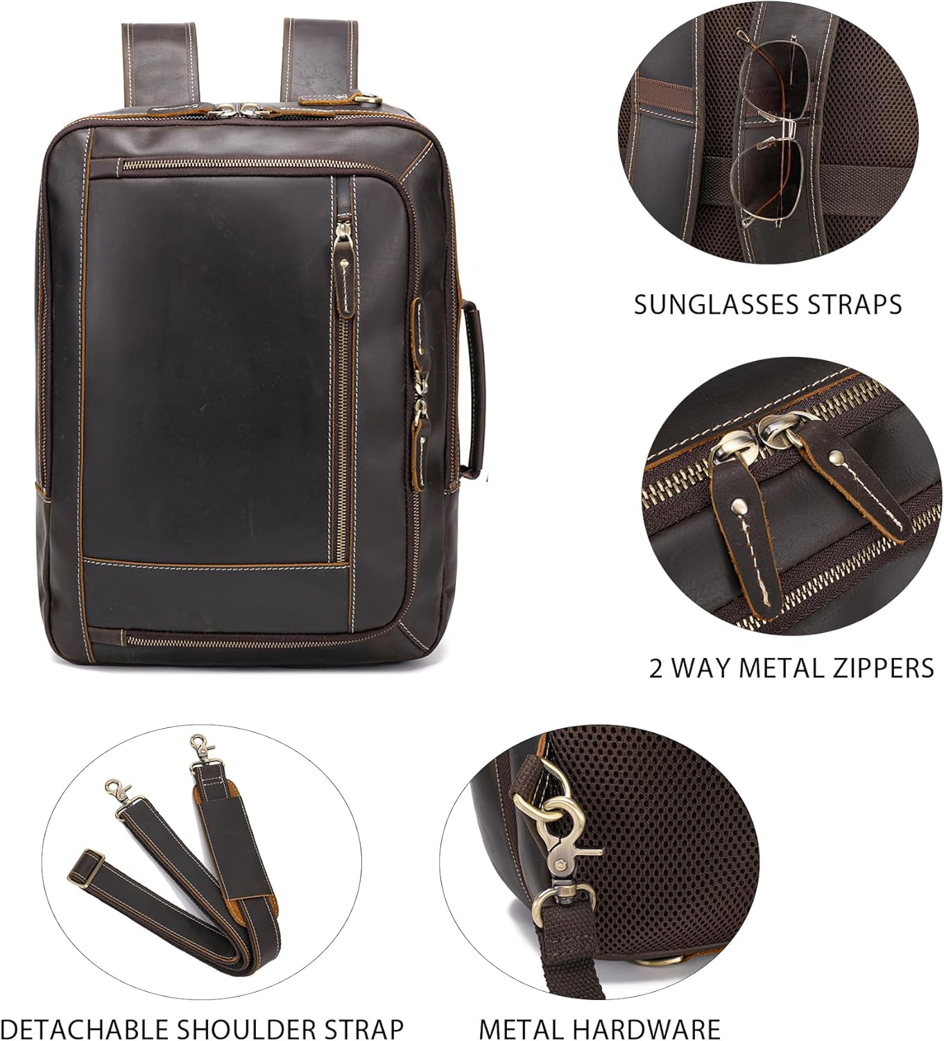 【CONVERTIBLE DESIGN】This leather travel backpack for men is designed with hidden padded shoulder straps that can be easily stowed into the back panel, converting this backpack from a carry on bag to a briefcase style, providing you with more flexibility in carrying experience. And Luggage strap on the back of this rucksack can hold the backpack on a rolling luggage to make your travel easier.