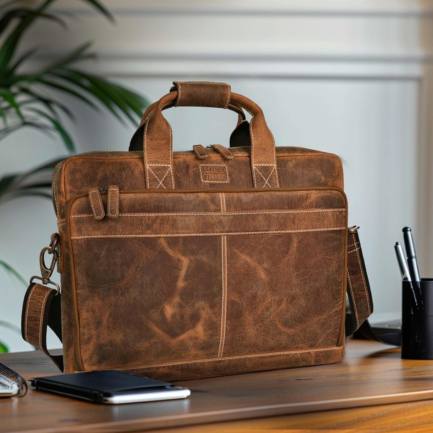 Premium Top Grain Leather: Crafted from high-quality Water Buffalo Leather, this laptop bag is designed by experienced craftsmen and features durable, genuine YKK zippers with antique brass fittings.