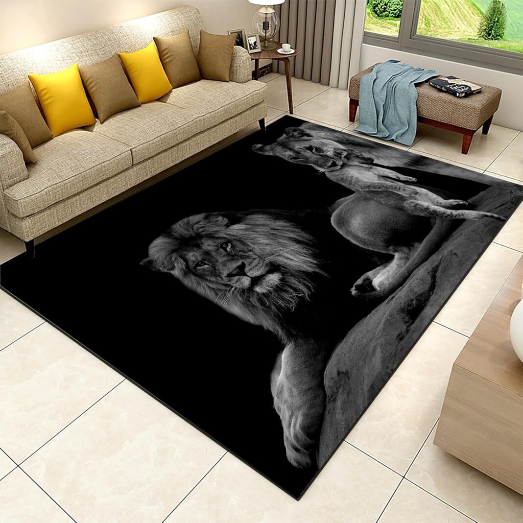 Lion rug for men brings the majestic feel of wildlife indoors; tiger carpet is a bold and expressive forest animals mat that makes your floor a visual focal point