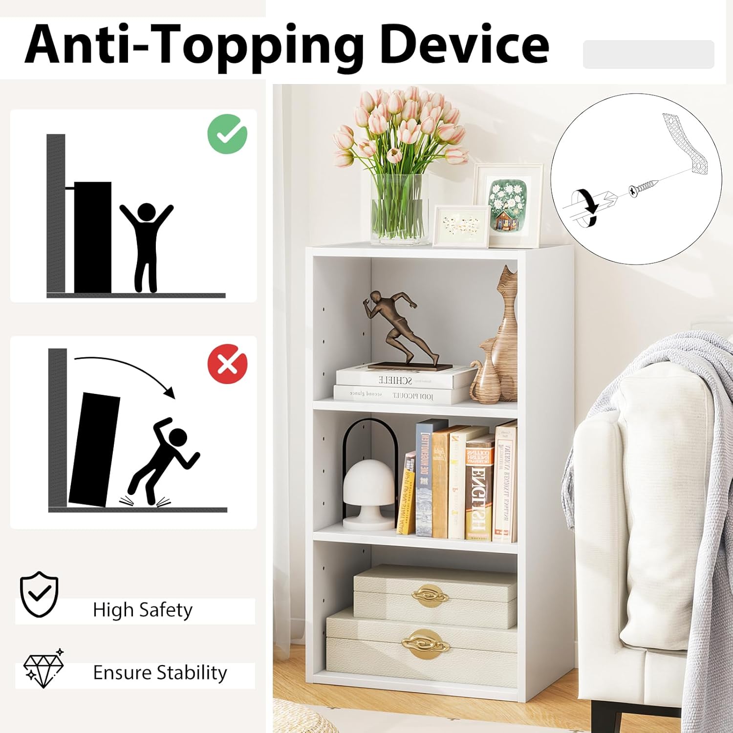 Stable & Safe Construction: Made of sturdy MDF material, this bookcase storage shelves have a stable construction and excellent weight capacity. And anti-topping device keeps the bookshelf firmly fixed to the wall, ensuring high safety and stability for your peace of mind.