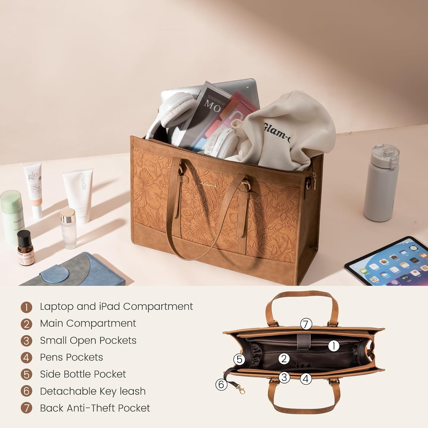 👒 VERSATILE AND PRACTICAL ☛ Built-in key hooks are perfect for keys or other accessories. The back pocket provides convenient storage space for your phone, wallet, and other small items! A side pocket in the bag is used to hold a water bottle or umbrella. The metal bottom nail makes our work shoulder bag wear and stain-proof.