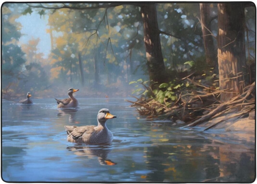 Every detail is crafted with care – our Mallard ducks swimming printed decorative rugs are made of high-spec polyester flannel, with fine and compact pile that resists pilling and fading. The memory foam middle layer dynamically adapts to foot pressure, relieving fatigue from standing or walking for long periods of time. The non-slip bottom design is designed to protect the safety of your family, especially for families with elderly people and children. It is easy to clean, can be washed by water or machine, and has excellent durability. The exquisite cutting and stitching craftsmanship ensures that the edges are flat and burr-free, making it easy to integrate into the bathroom, bedroom or office.