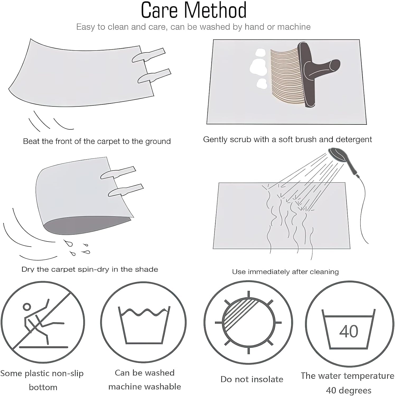 ④Our car rug is easy to care for, just wipe or machine wash for deep cleaning. Do not soak for more than 30 minutes, do not use hot water for washing, and please dry in a ventilated place after washing without exposure to the sun.