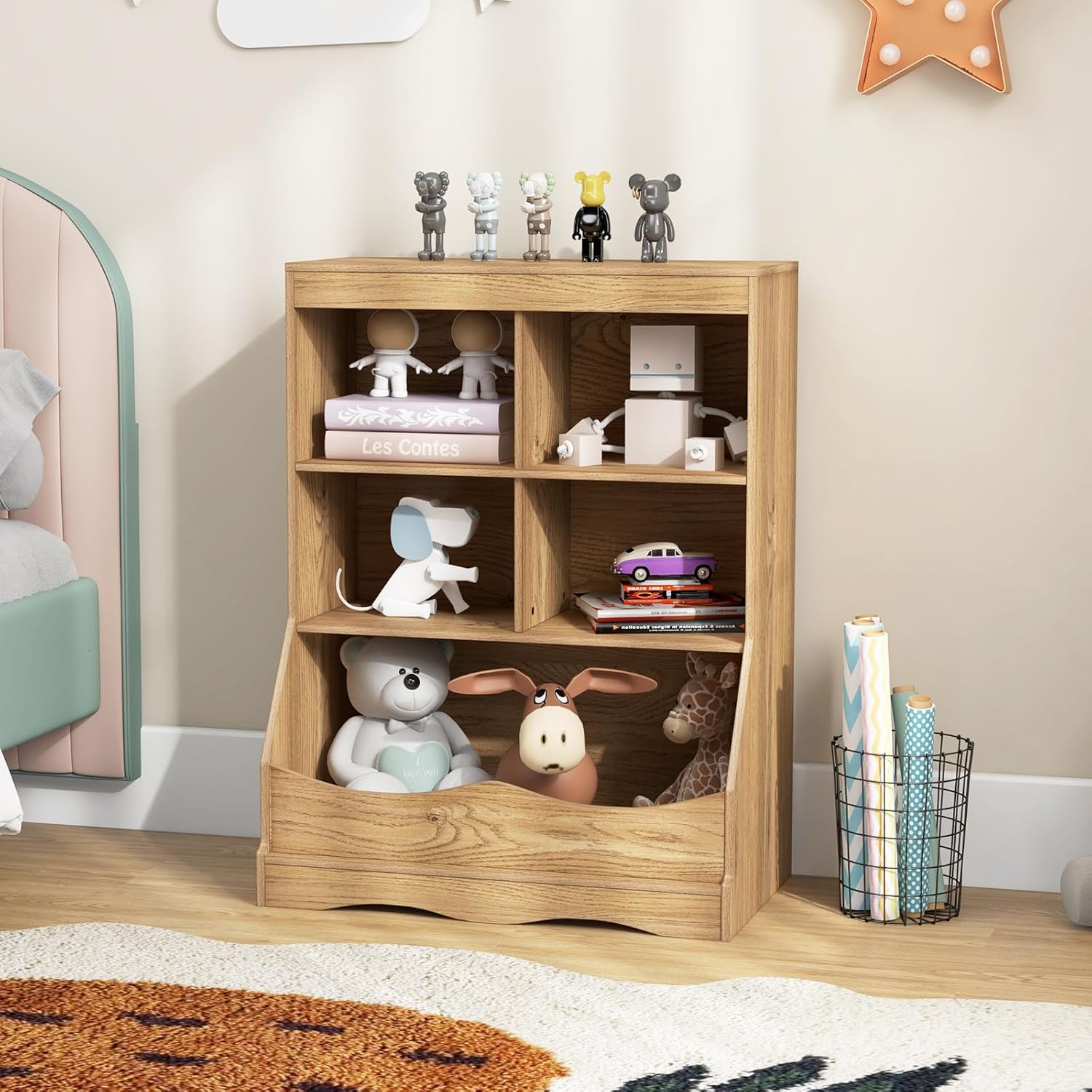 Abundant Storage Space: This toy storage organizer boasts a spacious design with three tiers and five compartments, providing ample storage options for your child’s toys, books, and other belongings. It helps keep everything organized and easily accessible.