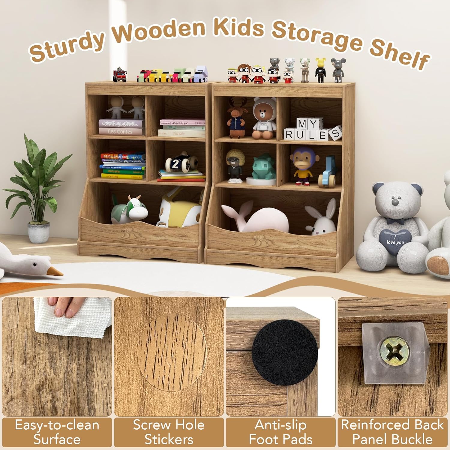 Versatile Usage Across Multiple Scenarios: Beyond its primary use in a child’s room, this wooden toy storage unit can also serve as a versatile storage solution in other areas of your home. Place it in the living room to store magazines, remote controls, or other household items, adding both functionality and style to your space.