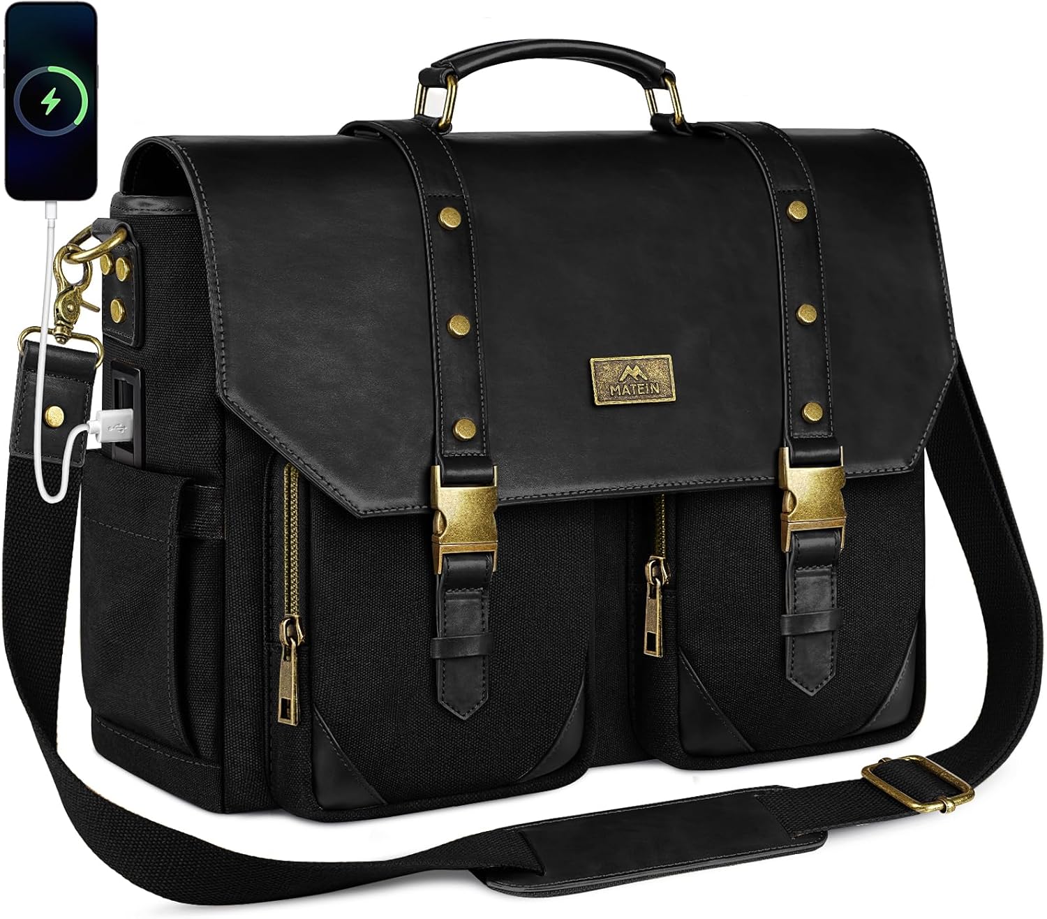 This Vintage Messenger Bag masterfully blends industrial-era aesthetics with cutting-edge functionality. Built from water-resistant canvas and reinforced with abrasion-resistant PU trim, messenger laptop bag for men rugged exterior features antique bronze hardware—including distressed zippers, rivets, and a signature clasp lock—that ages gracefully while enduring daily demands. The reinforced stitching and triple-layer corner guards ensure longevity. Our mens messenger bag crossbody combines classic craftsmanship with modern utility. Stay connected through its USB charging port (external power bank required), discreetly linked to the inner pocket. Designed as a functional messenger bag with charger, it adapts effortlessly: detachable straps, ergonomic handles, and a vintage work bag aesthetic. The men’s messenger bag black combines rugged durability with minimalist design, while the leather messenger bag elevates your style with timeless craftsmanship. Designed as a spacious messenger laptop bag for men work, it seamlessly organizes essentials for daily commutes or work. RFID-blocking hidden pockets guard against digital theft, and the back luggage sleeve ensures effortless transit. Clean lines meet heritage-inspired resilience—crafted for professionals navigating work, college, and beyond. EfficIent Organization System With 14 intelligently designed compartments, this Leather laptop bag for men conquers clutter: Front Quick-Draw Zone: Lockable zipper pocket, organizational panels with key ring Side Pockets: Water bottles or compact umbrellas Main Compartment: Padded laptop compartment, tablet sleeve, and document folders Wet Pocket: Store wet items without getting other items wet Measuring 15.35*5.51*12.9 inch (LxHxW) and weighing just 3.2lbs, this canvas work bag for men transitions effortlessly from campus to boardroom. The satchel messenger bag for men is the perfect gifts for Valentine’s Day, birthdays, Teacher’s Day, graduation ceremonies, and other occasions.