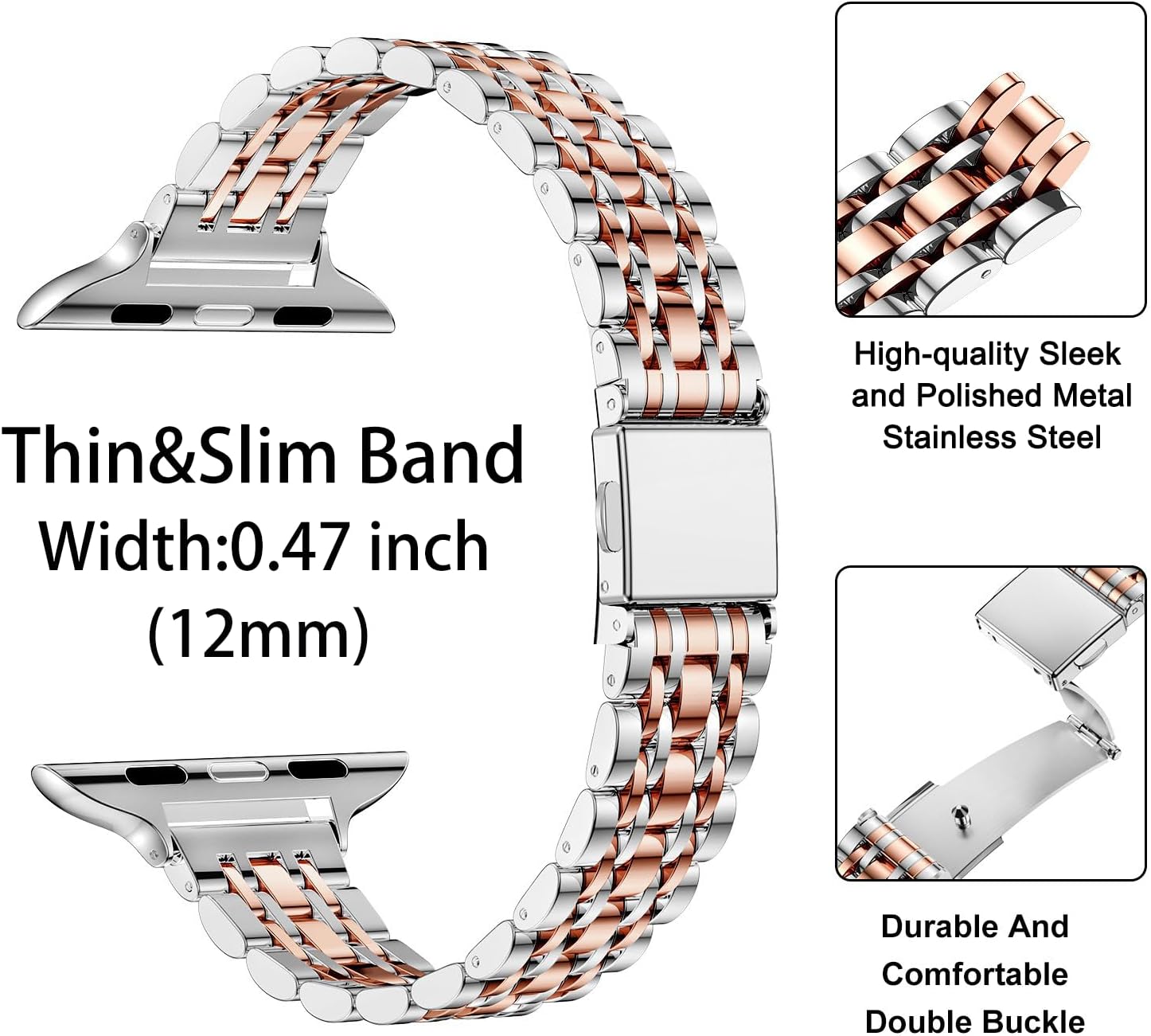 【Looks Great】New come narrow and collect-waist design thin apple watch bands to get rid of the bulky ordinary steel band for apple watch, the slim apple watch band width is only 12-14 mm. It doesn’t add burden to the wrist, and it highlights the femininity even more.