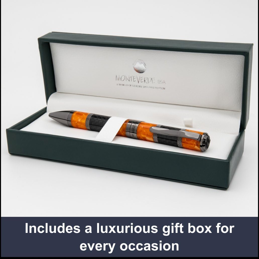 Striking Aesthetic: This ballpoint pen features bold orange resin segments paired with carbon fiber and diamond-cut gunmetal rings, offering a durable and visually captivating design.