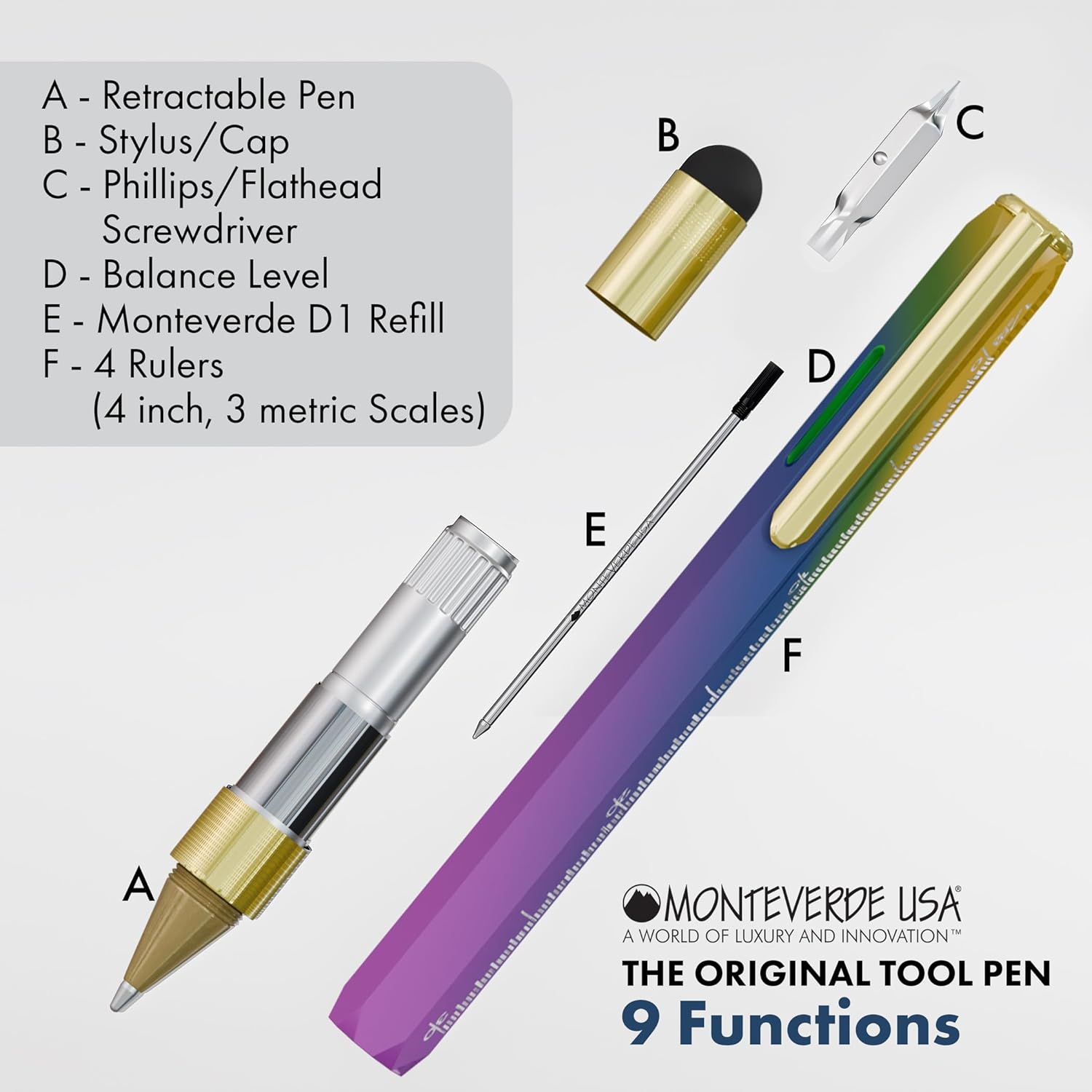 Monteverde USA – Over 25 Years of Excellence: With over 25 years of experience, Monteverde USA is a leader in luxury writing instruments, trusted by professionals worldwide. This 9-in-1 Tool Ballpoint Pen in Rainbow is part of an exclusive collection that highlights the brand’s commitment to quality and innovation.