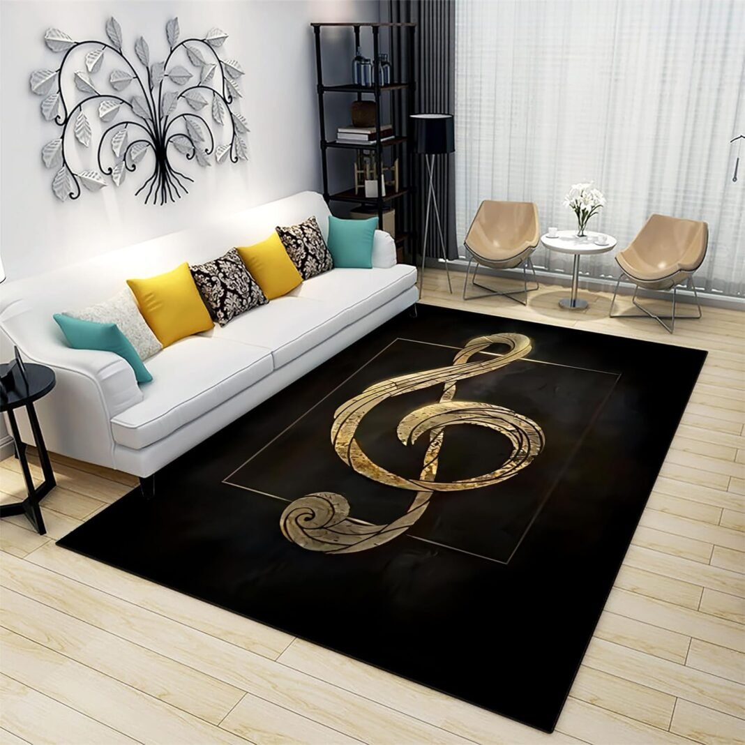 Music Area Rugs 6x8ft Minimalism Golden Musical Note Indoor Non-Slip Area Rugs Simple and Stylish Machine Washable Durable Carpet for Living Room Bedroom Study Dining Decor Mat