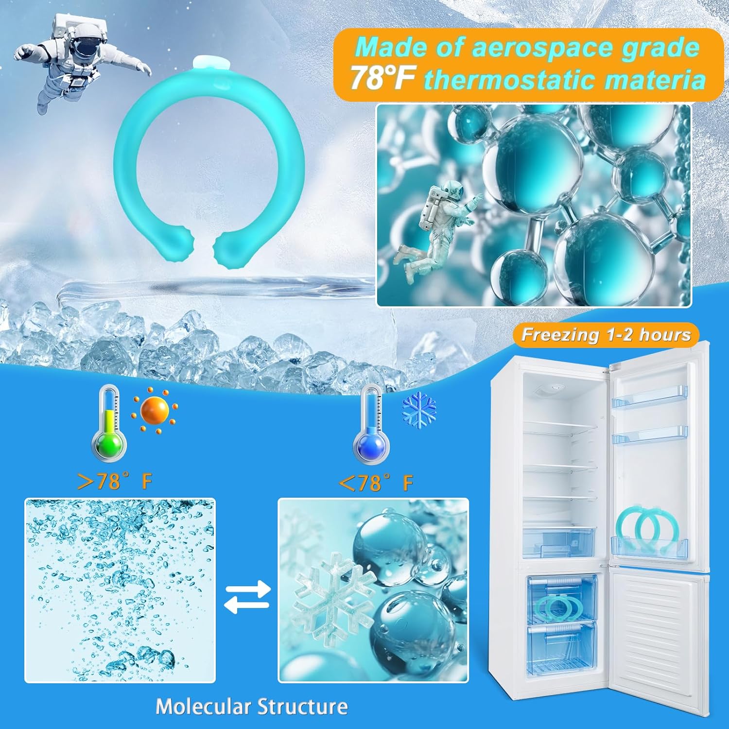 [Healthy and Eco-friendly Design] -Neck cooling tube is made of aerospace grade bio-based thermostatic material. It is biologically characterized by an automatic freezing at temperatures below 78.8 °F(26°), which results in a cooling effect. The outer layer is made of ring-shaped high-quality elastic TPU, high sealing and does not hurt the skin. This cooling neck wraps ensures a safe and effective cooling solution for your daily use.