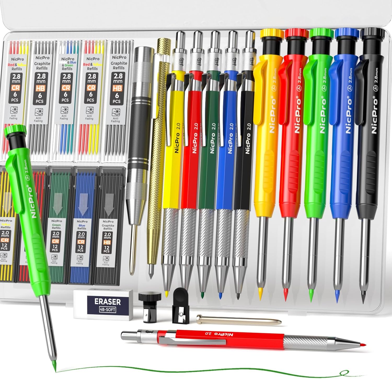 Nicpro 26 PACK Mechanical Pencil set INCLUDE: 5 x 2.8mm Pencils, 30 x 2.8mm Lead Refills, 5 x 2.0mm Pencils, 60 x 2.0mm Lead Refills, 1 x Carbide Scribe Tool, 1 x automatic Center Punch Tool, 1 x Punch Replacement Tip, 1 x Eraser, 2 x Sharpener, 1 x case