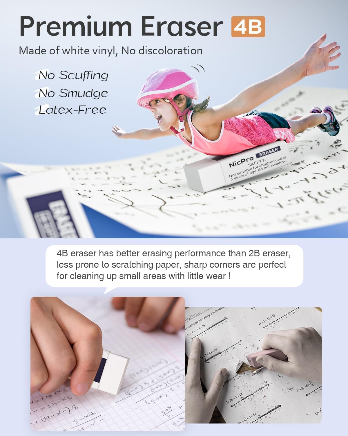 Nicpro Blocky Gear:Come with 3PCS metal 0.5mm mechanical pencil and 8 tube of 0.5 mm lead refills (6 tube of HB and 2 tube of 2B), 60pcs / tube, 3pcs 4B latex-free eraser, 18pcs replaceable cap erasers,1 pcs kneaded eraser, all the stuff storage neatly in a case with flocking tray,what a gift for friends & family!Ideals for artists, professionals, teachers and students alike