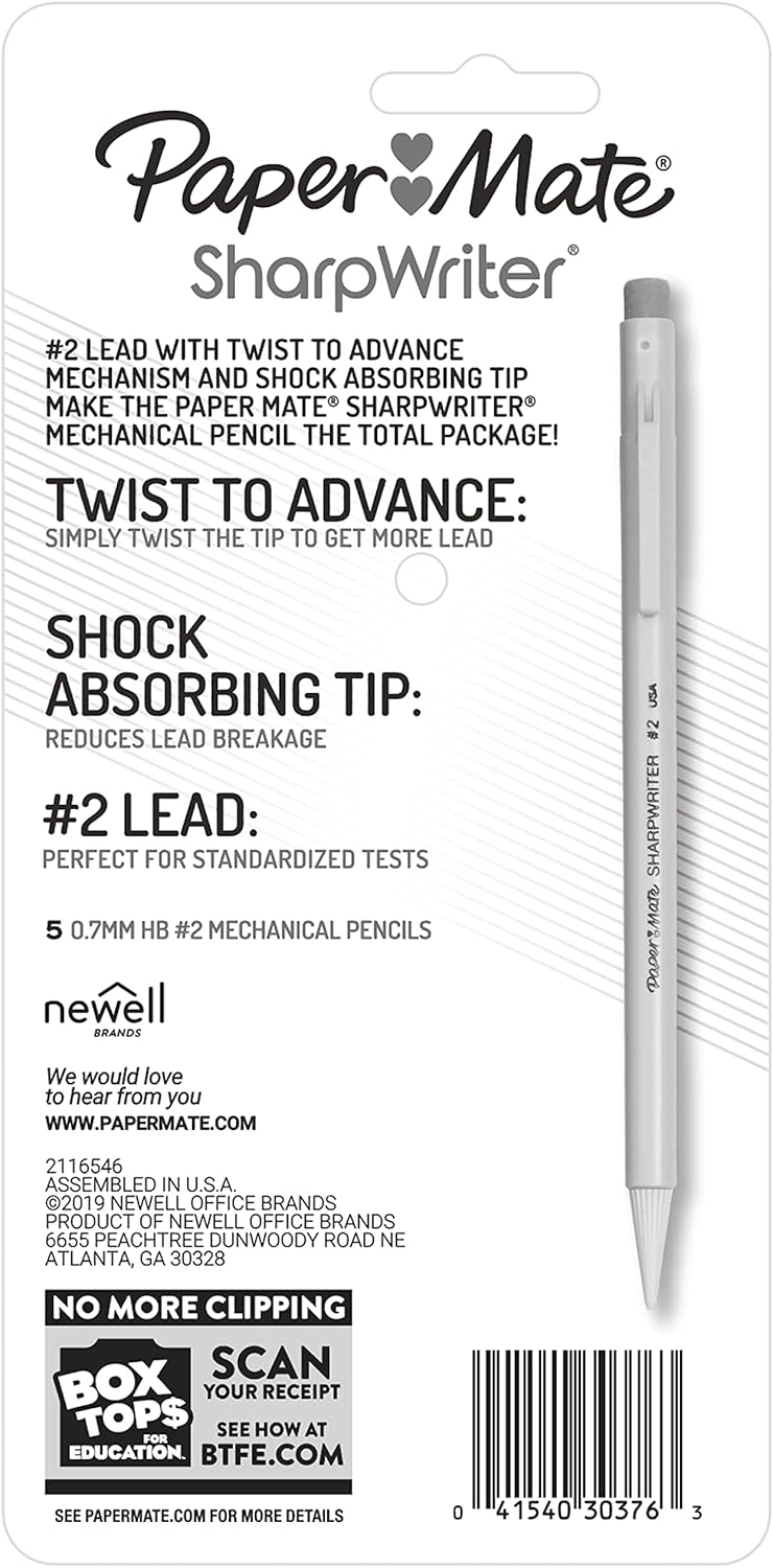 Make smooth, accurate marks with easy-to-use Paper Mate SharpWriter Mechanical Pencils. The cushion point on these Paper Mate pencils adjusts to your writing, reducing lead breakage. The twist-to-advance mechanism easily advances the lead while the plastic pocket clip keeps your pencil handy.
