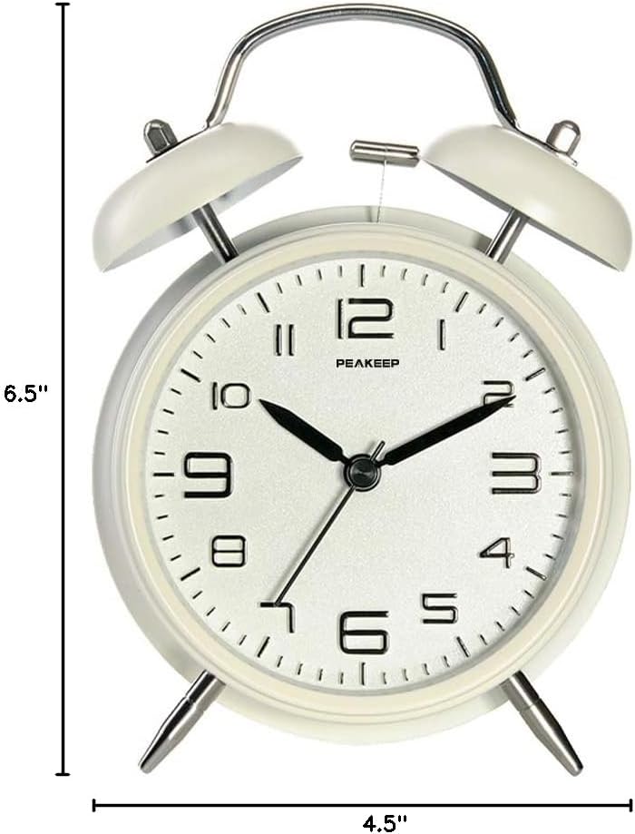 Peakeep 4 Inches Twin Bell Loud Alarm Clock for Heavy Sleepers, Backlight, Battery Operated Old Fashioned Alarm Clock for Bedrooms (White)