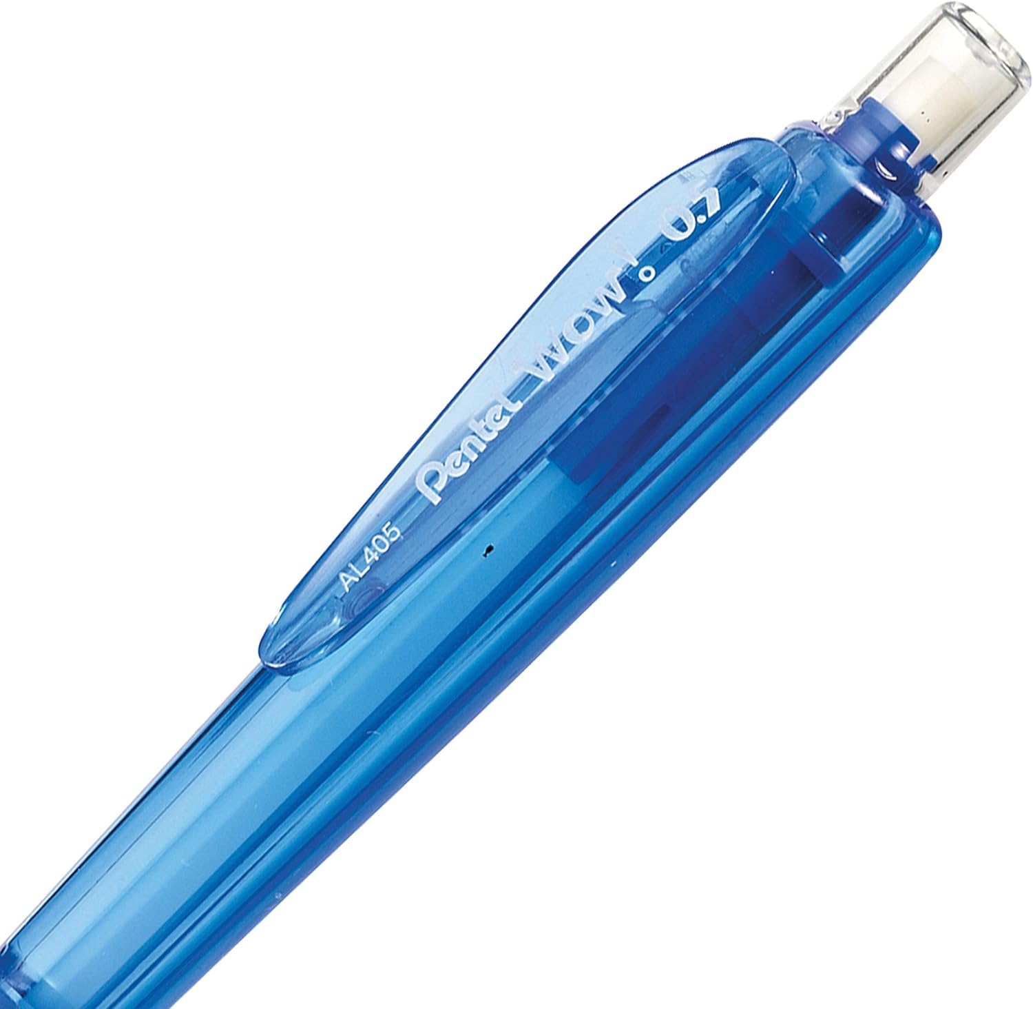 The Pentel® Wow!® Mechanical Pencil is a low price Pencil with many features found in more expensive pencils. The unique triangular shape barrel and grip makes it easy to hold and keeps the Pencil from rolling off writing surfaces. Its distinctive design stands out in a crowd. Keep writing even if your lead breaks with our unique retractable tip design. Plus, the fully retractable tip protects pockets & purses. Available in 0.5mm & 0.7mm lead sizes, it comes pre-loaded with Pentel® super Hi-Polymer® HB lead – guaranteed to scan on standardized tests, never needs sharpening and produces a clear dark line.