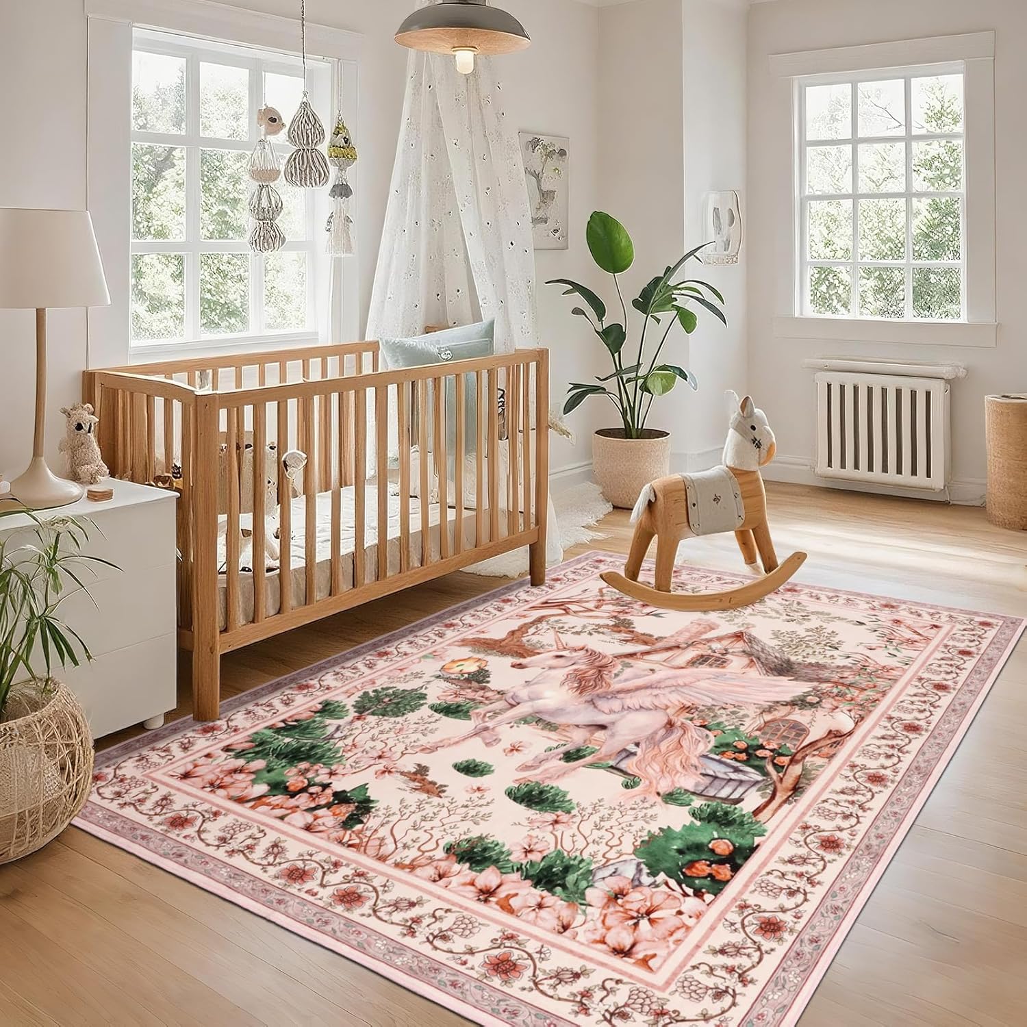 đŸ¦„DREAMY UNICORN RUG: This enchanting washable area rug for nursery features a majestic unicorn nestled among blooming flowers, quaint cottages, and gentle trees. Infuse your space with storybook charm and cozy warmth