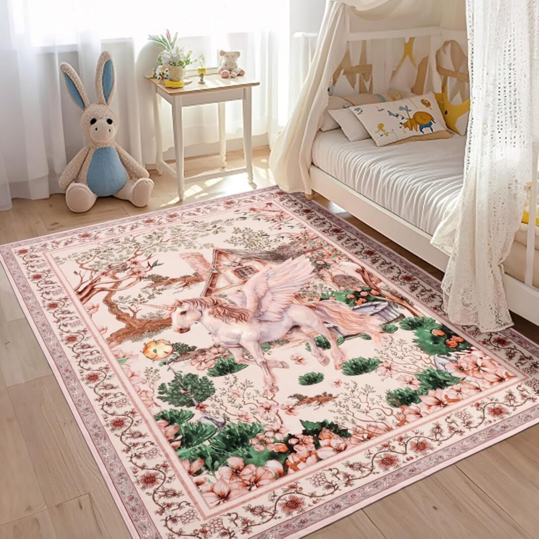 đŸ¦„DREAMY UNICORN RUG: This enchanting washable area rug for nursery features a majestic unicorn nestled among blooming flowers, quaint cottages, and gentle trees. Infuse your space with storybook charm and cozy warmth