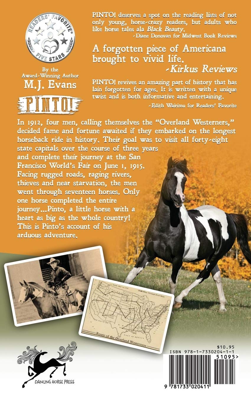 In 1912, four men, calling themselves the “Overland Westerners,” decided fame and fortune awaited if they embarked on the longest horseback ride in history. Their goal was to visit all forty-eight state capitals over the course of three years and complete their journey at the San Francisco World’s Fair on June 1, 1915. Facing rugged roads, raging rivers, thieves and near starvation, the men went through seventeen horses. Only one horse completed the entire journey…Pinto, a little horse with a heart as big as the whole country! This is Pinto’s account of his arduous adventure.