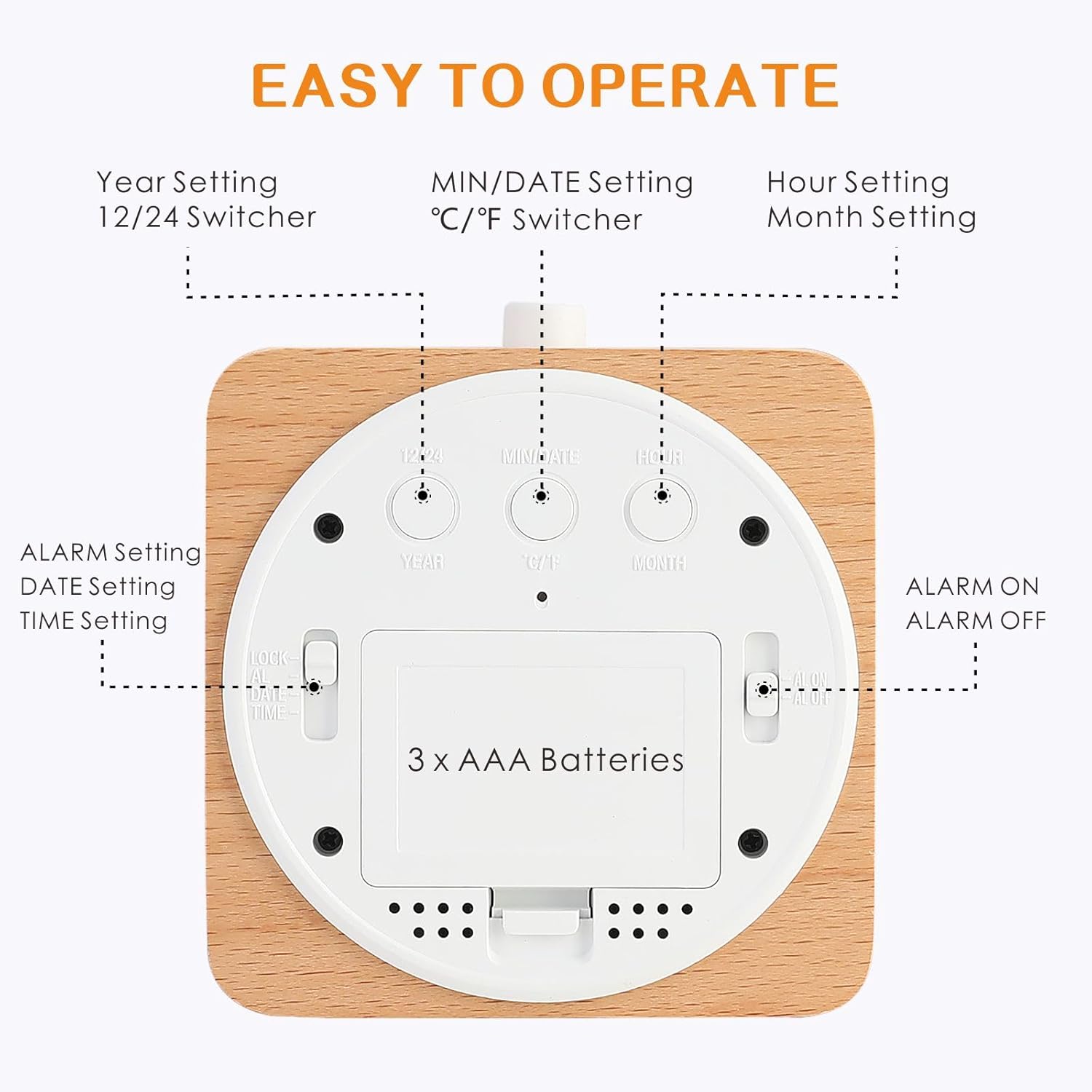 Orange Backlight – Simply press the top button to activate for 5 second night viewing. the clear and comfortable orange night light won’t disturb your sleepy eyes. The screen display time, indoor temperature(C/F), date and alarm time. great for the senior people or the sight-restricted people.
