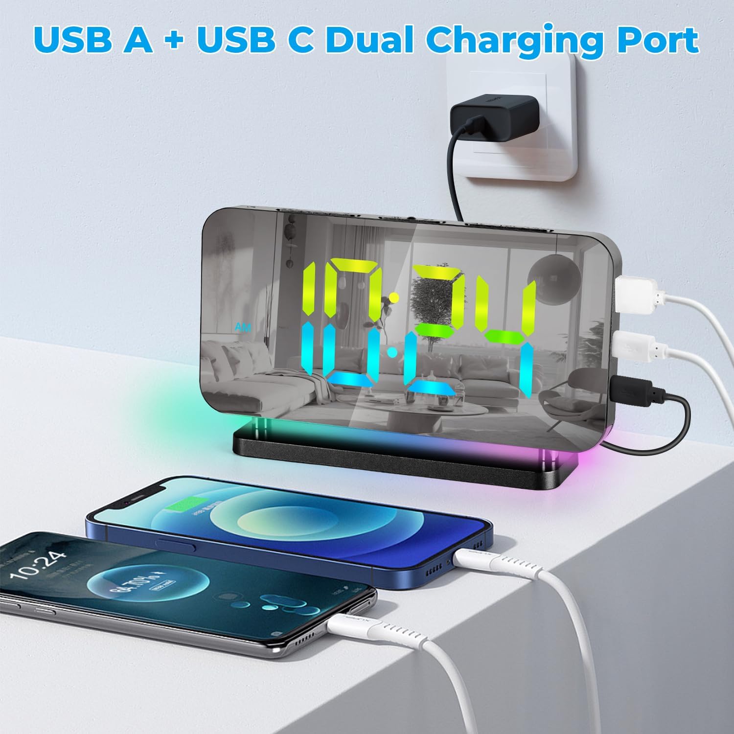 ⏰USB C CHARGING POR — LED Desk Clocks has 2 USB charging ports (1 USB Type C + 1 USB A, DC 5V/1A), which can charge 2 devices at the same time, solving your charging worries.
