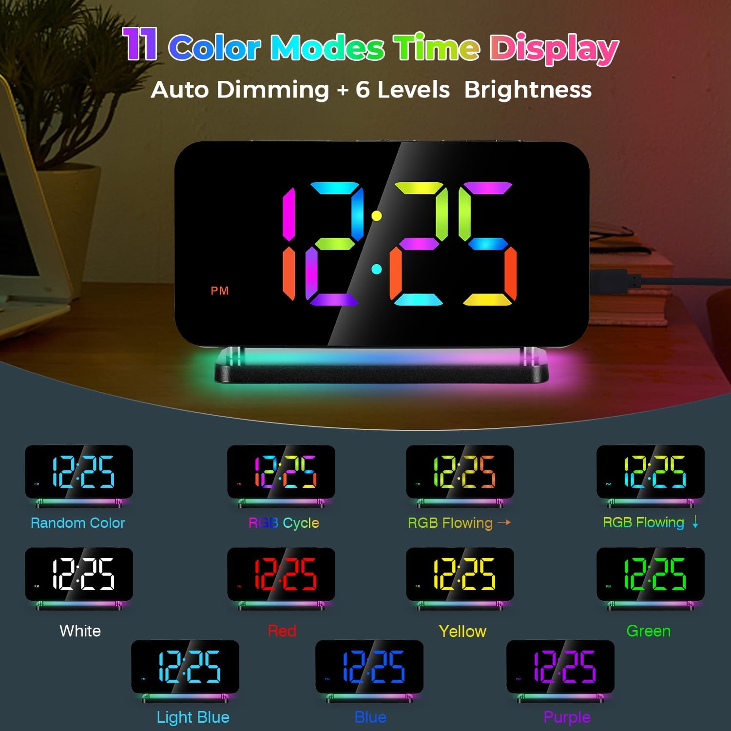 ⏰HD COLOR DIGITAL — LED Alarm clock uses a color-changing LED display with 11 color modes (4 dynamic RGB colors + 7 fixed color modes), 6-level brightness manually adjustable, and automatic dimming function can also be selected.