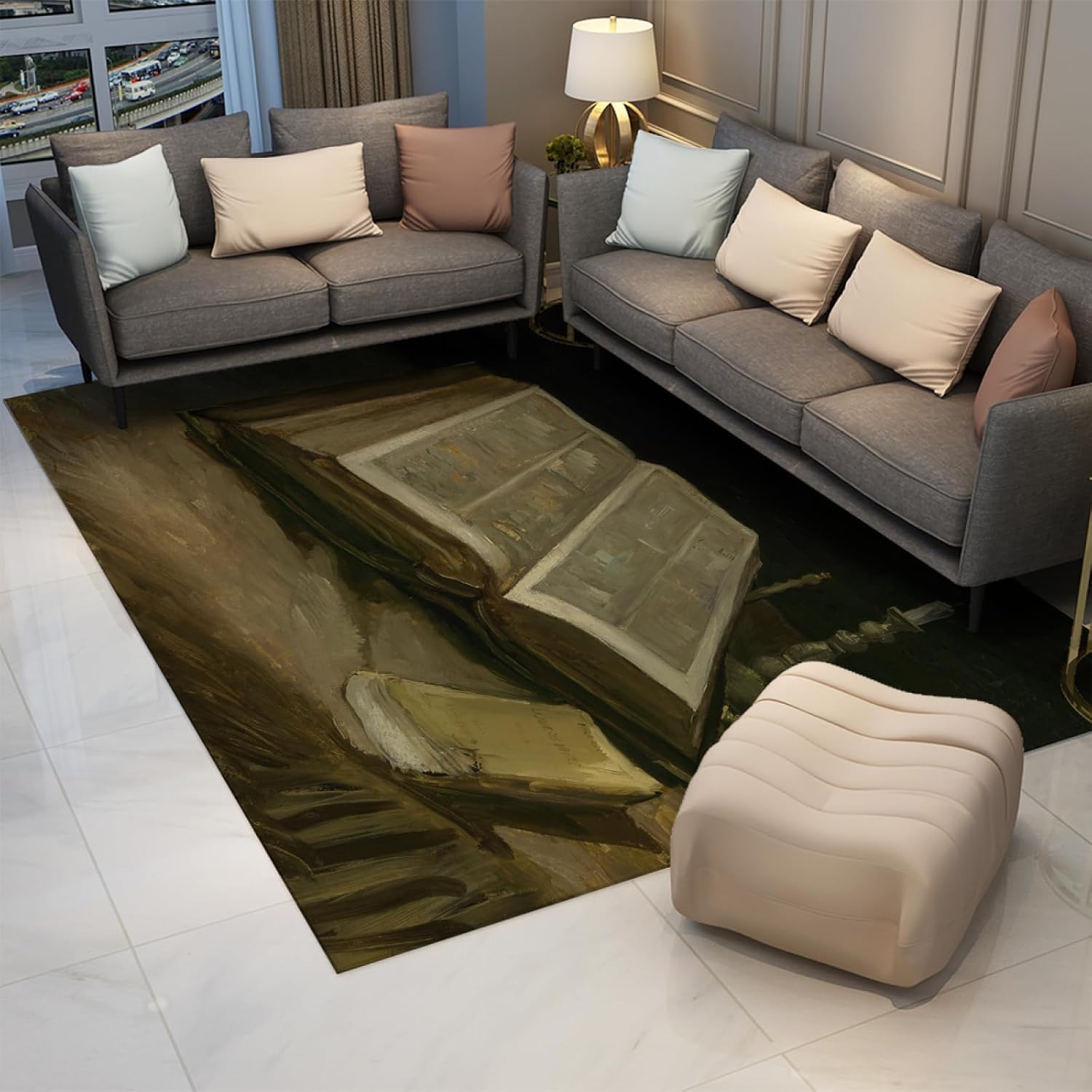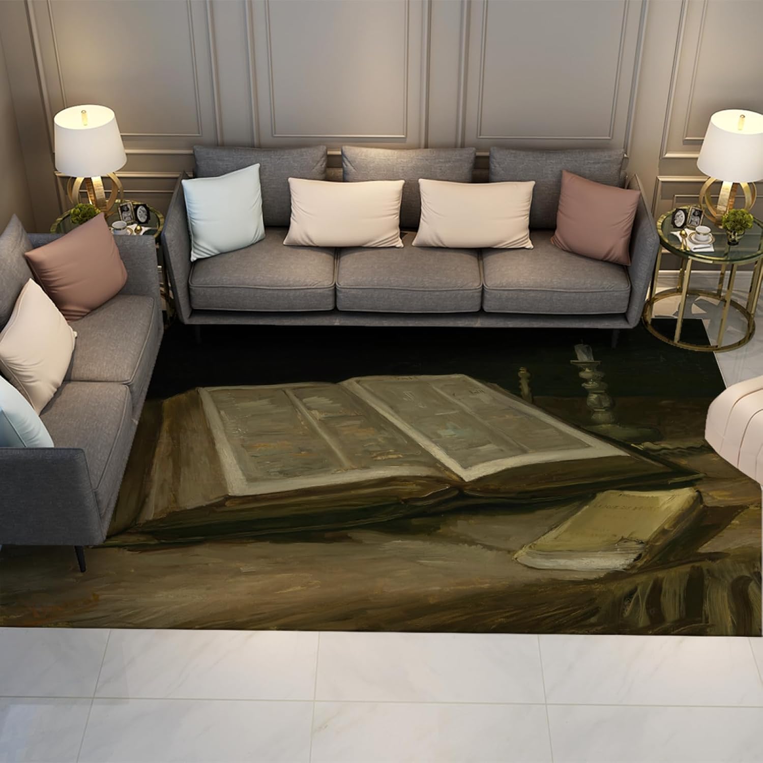 Retro Large Area Rug Famous Painting Print Rugs Low Pile Floor Mat Books Pattern Carpet for Living Study Room Bedroom Classroom 5’x8′