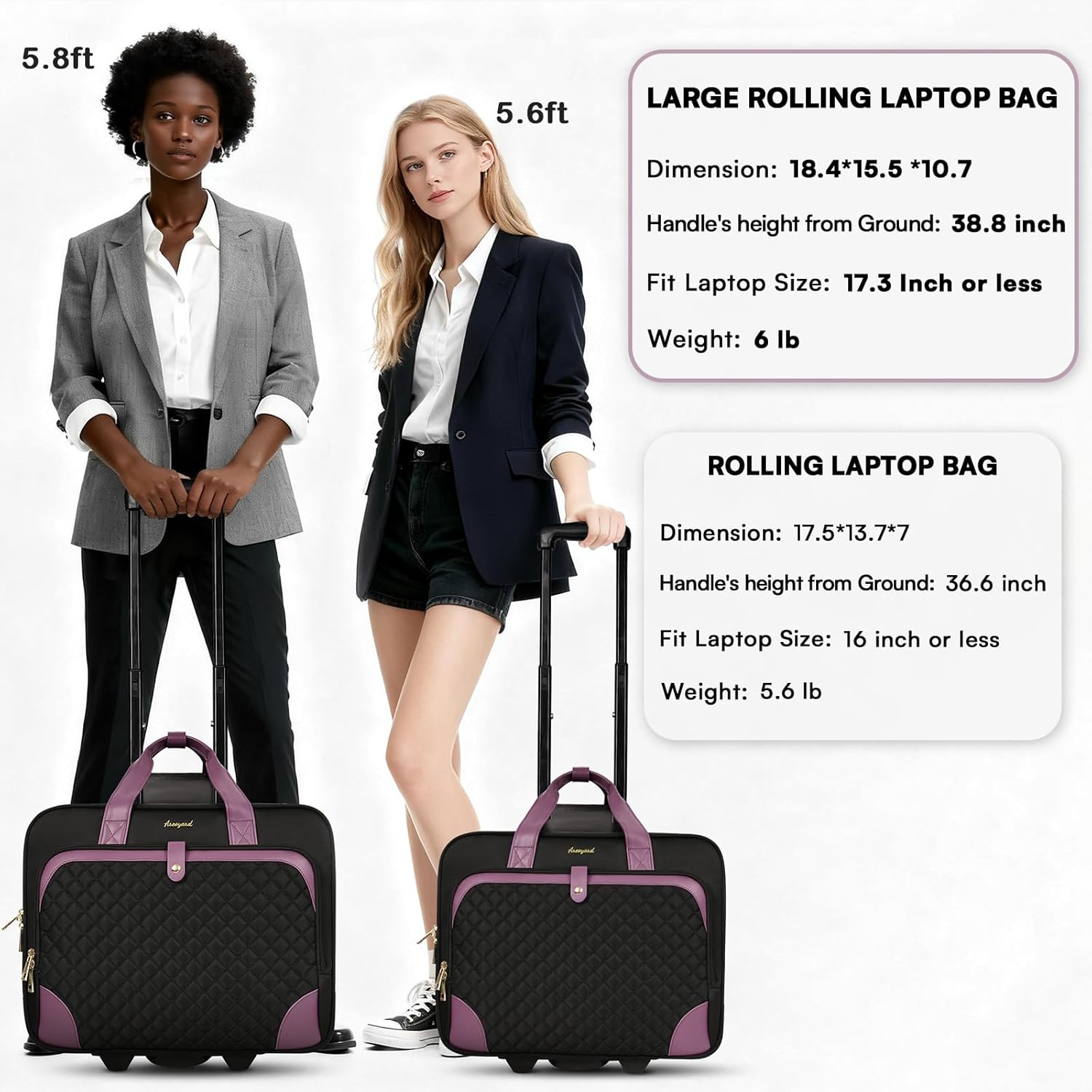 Lifetime After-sale Service: Worry-Free After-Sales Service. If you have any questions about our Arcoyard rolling laptop bag for women, please let us know!