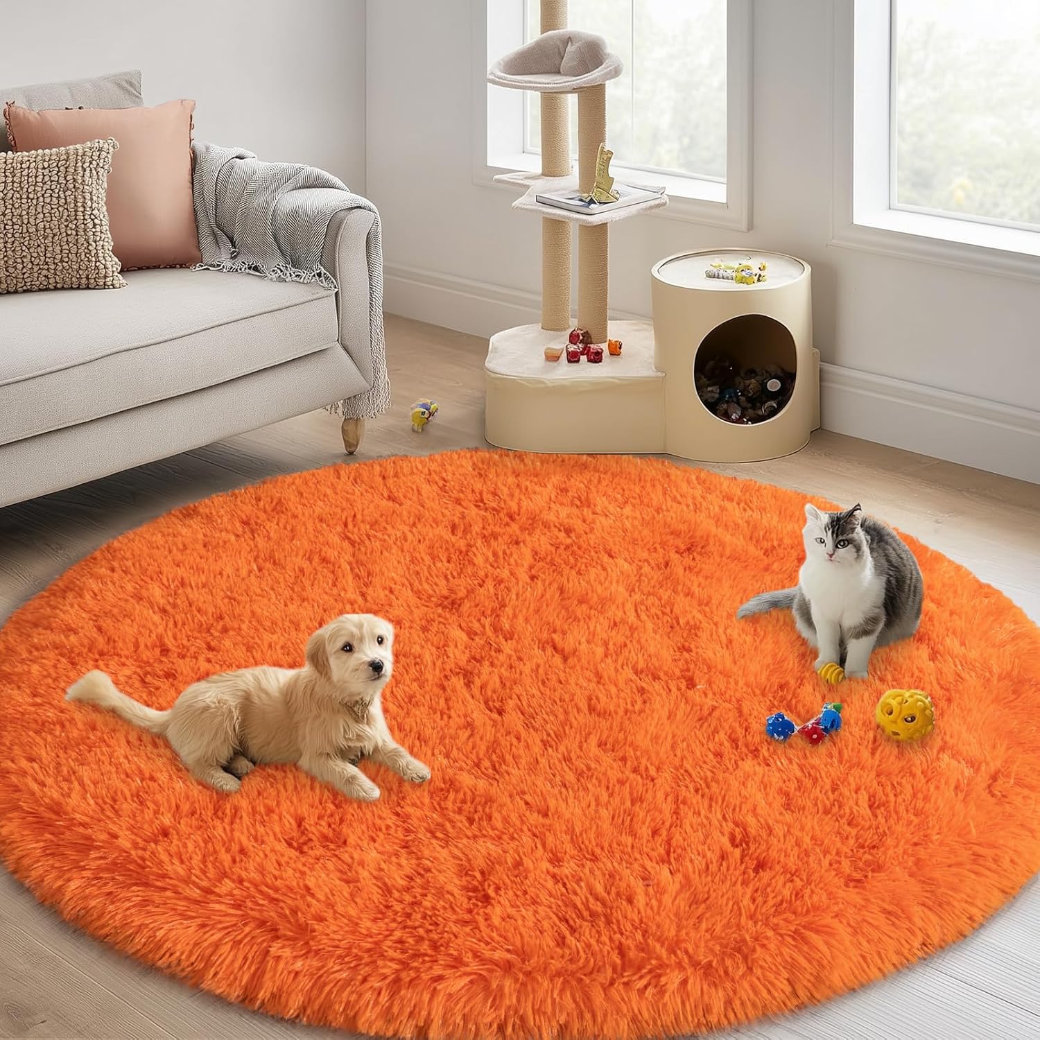 KEY ATTRIBUTES: Shape: round rug | Size: 6 ft | Thickness: 1.7 inches | Color: orange | Please note that due to vacuum packing, the orange fluffy rugs may arrive with temporary creases and odor, please unfold the carpet and leave it for 2-3 days for it to fluff up and the creases and odor will be reduced