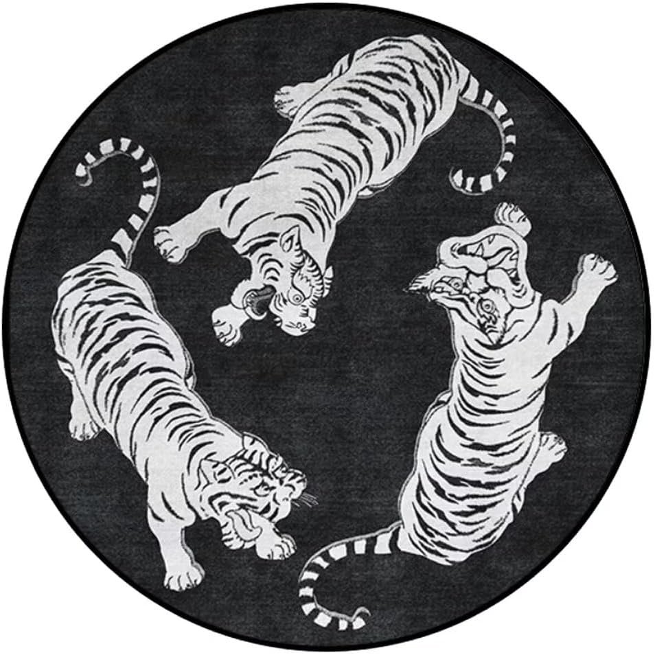 Round Tiger Rug Diameter 3 Feet Black&White Circular Animal Printed Area Rugs Washable Soft Non-Slip Floor Mat for Bedroom Office Kids Room Decor