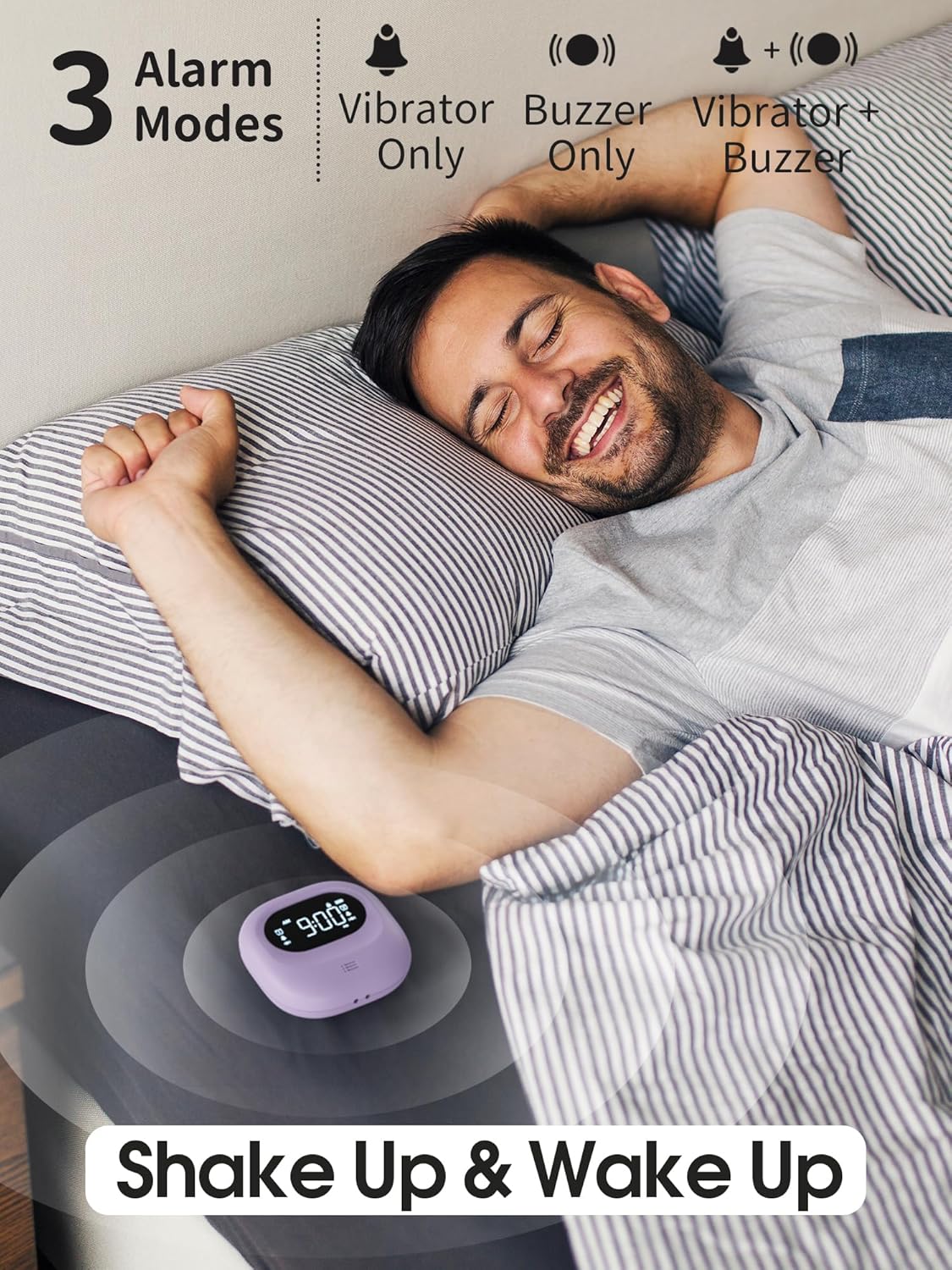【EXTRA LOUD ALARM CLOCK】 Always sleep through alarms? Hard to hear ordinary alarm when go off in the morning? Our super loud alarm clock for heavy sleepers is a life saver for you. Just put the vibrating clock under pillow and it will shake you up on time. Choose from 3 different ways to wake up with our bed shaker alarm clock: Vibration+Alarm, Vibration Only or Alarm Only. Customizable vibration intensities: High, Medium, Low and 5 alarm adjustable volumes.