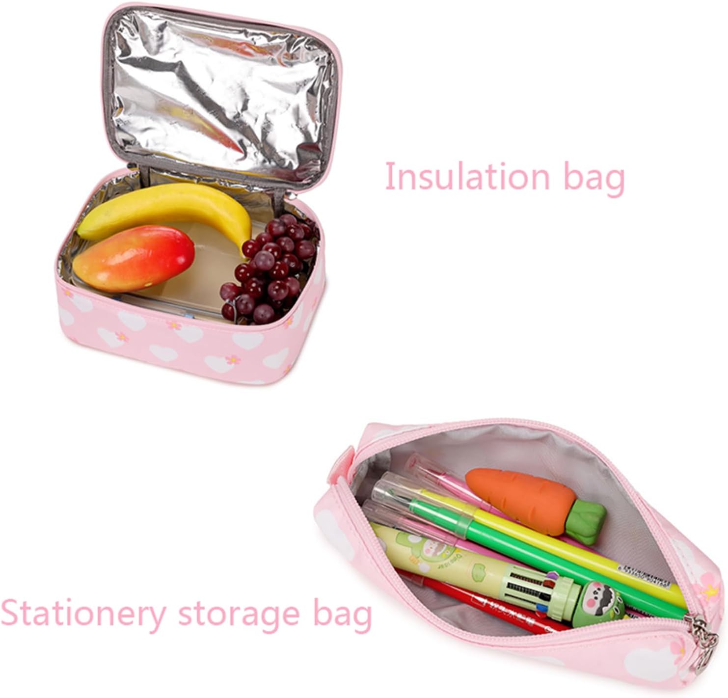 3pcs school Backpack set: 1*backpack +1*lunch bag +1*pen case.The backpack can hold books, and the lunch bag has a heat insulation function. The pencil case can hold pencils, stationery, and keys