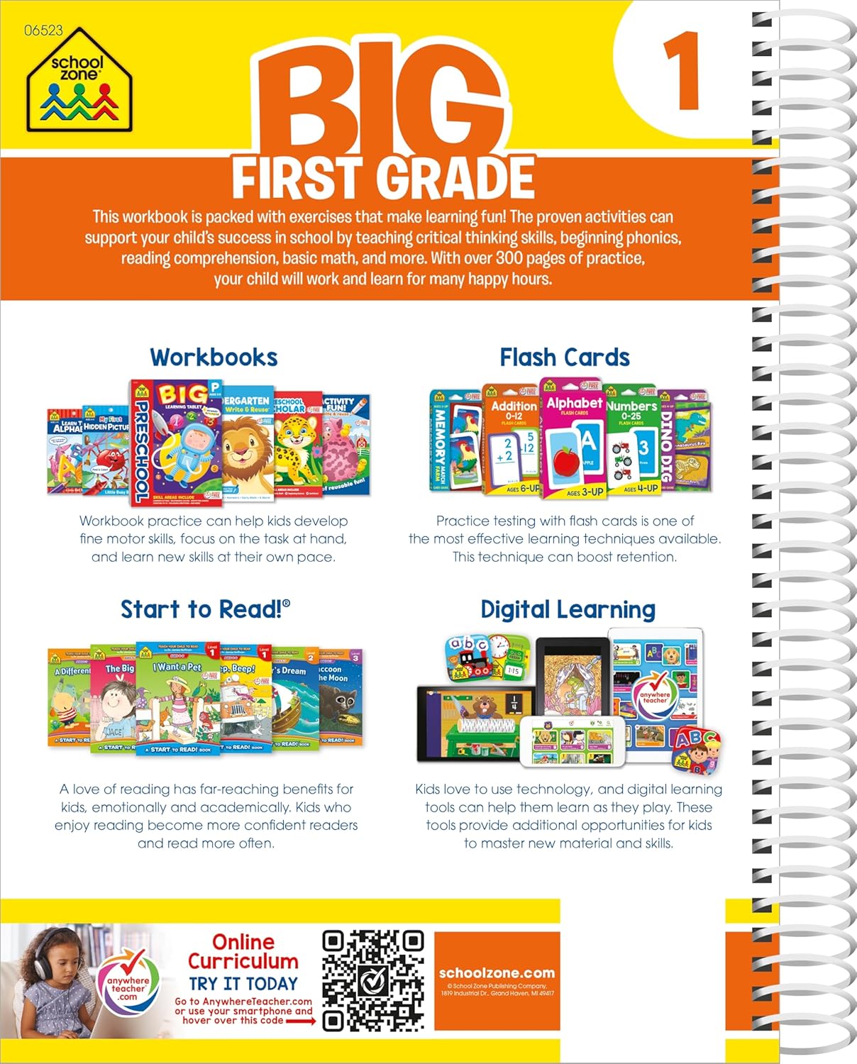 320 pages: 302 activity pages, 18 answer key pagesFor ages 6 to 77.75″ x 10.75″ pages with durable glossy coverBook has multiple sections with Parent notes for each: Time, Money & Fractions, Phonics & Spelling, Basic Math, Reading Comprehension, VocabularyColorful, kid friendly illustrations reinforce the lessonsEasy directions and visual clues promote self-directed learningConcepts flow from easy to more difficult, and pages are spiral-bound to easily lay flat for ease of work and maximum concentration