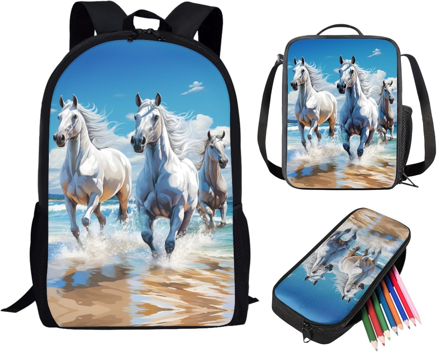 Showudesigns Horse Book Bags for Girls 10-12 Years Old Middle School Backpack With Lunch Box Pencil Case Set Kids School Bag for Boys Age 8-10 Elementary Primary School Bookbag 17inch Daypack