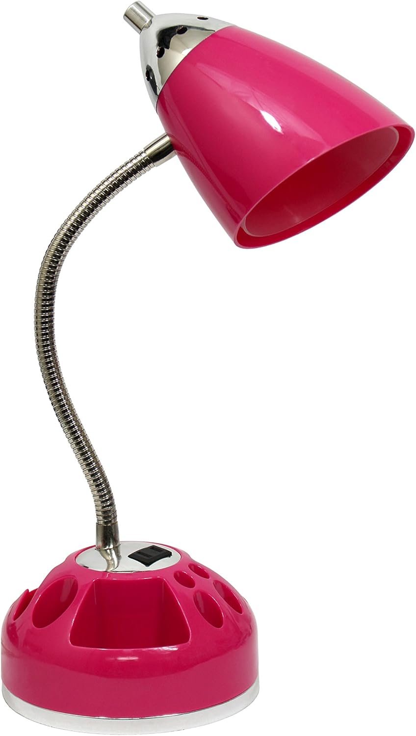 Style and functionality meet with this fun organizer desk lamp with charging outlet. Comes equipped to hold many of the important essentials needed in a desk organizer as well as the ability to act as an additional outlet. The flexible chrome gooseneck allows you to point the light exactly where you need it. ON/OFF switch is located on the shade for convenience. Organizer includes compartments for storing pens, pencils, paper clips, etc. It also has a spot to plug in your phone, tablet, or other device. Perfect for office, kids room, or college dorm!
