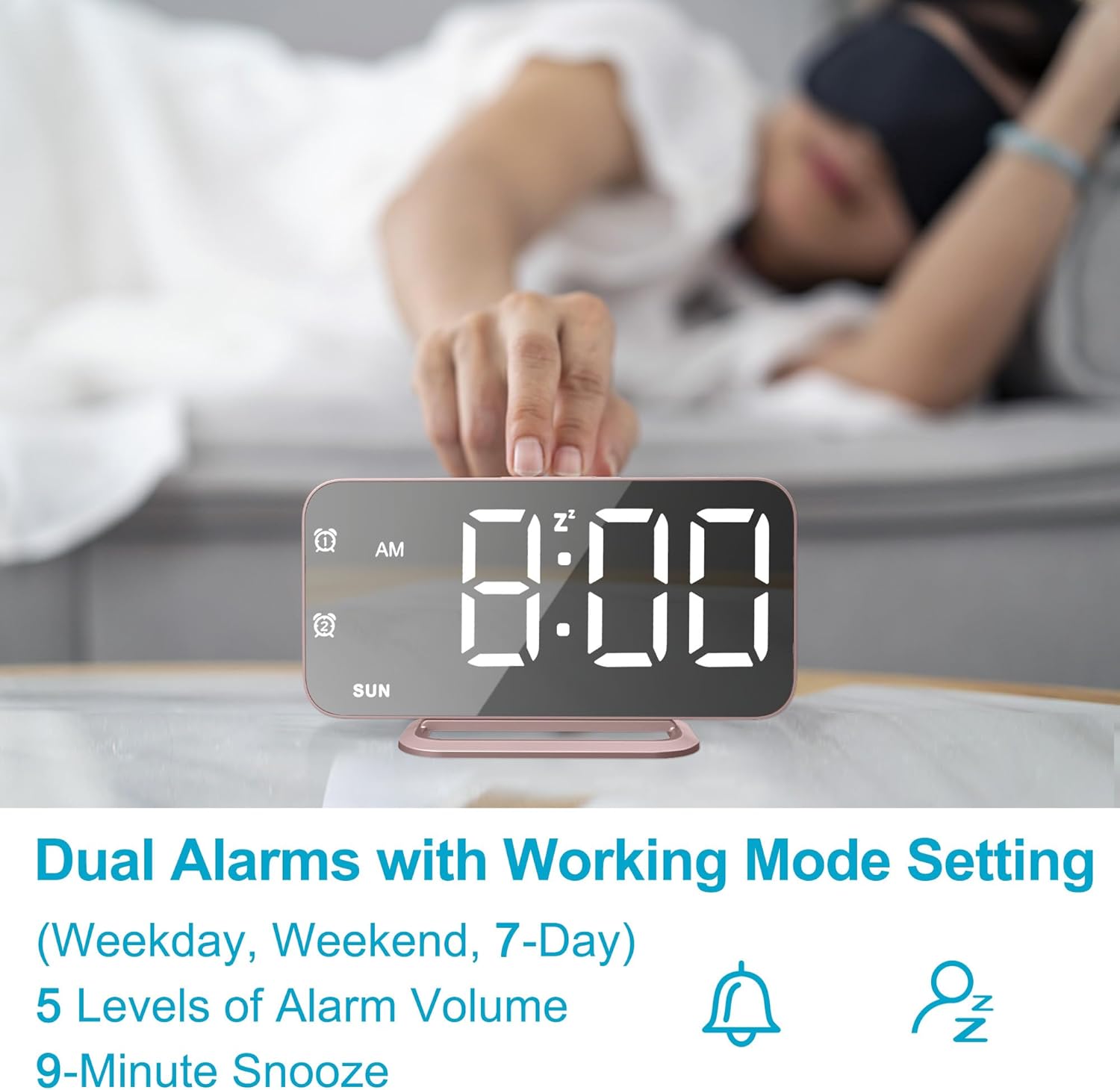 【Alarm Setting】Two independent alarms can be set up with different work modes, 1-7 (MON-SUN), 1-5 (MON-FRI), 6-7 (SAT-SUN), to meet the needs of the whole family. And there are 5 levels of alarm volume for you to select. Snooze button can get you an extra nine minutes of sleep.