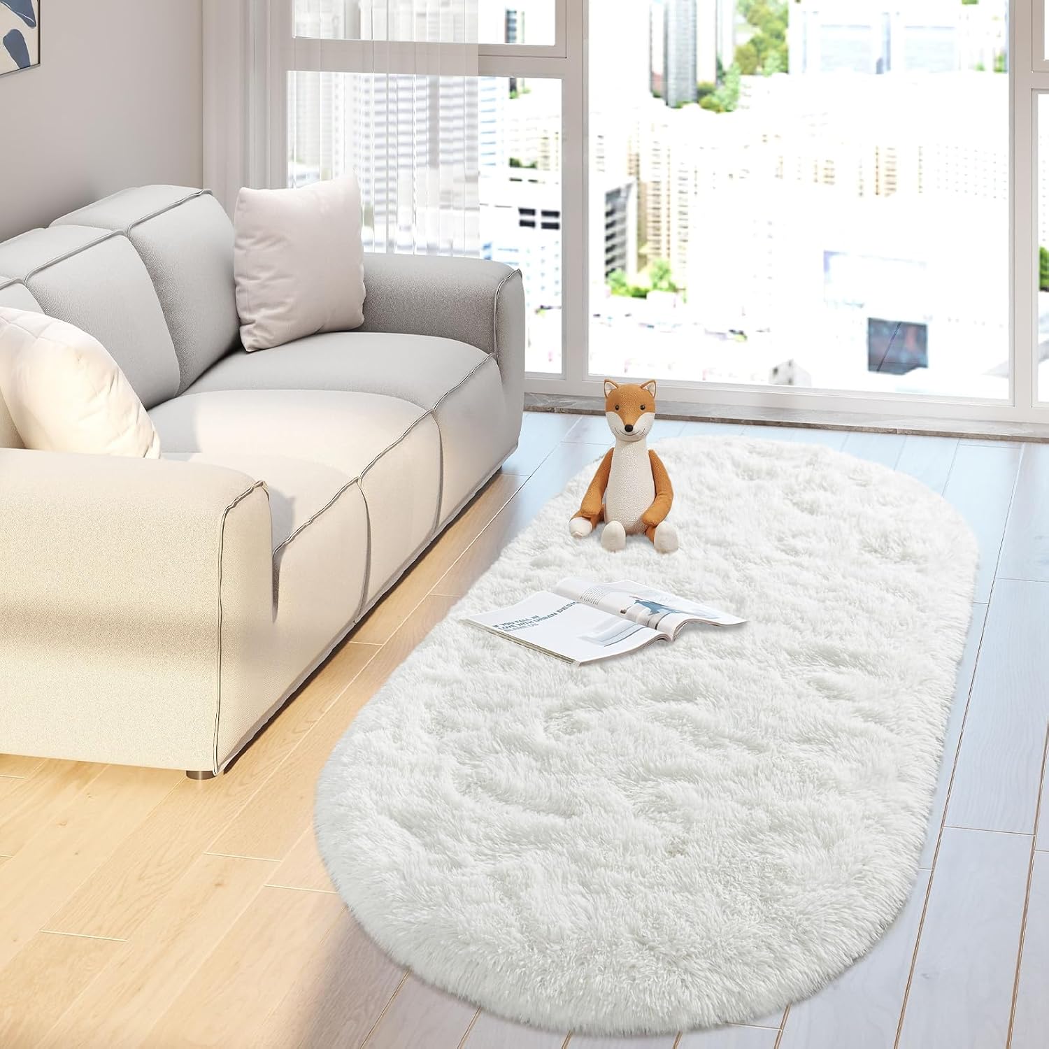 KEY ATTRIBUTES: Shape: oval | Size: 2.6 x 5.3 ft | Thickness: 1.7 inches | Color: cream white | Please note that due to vacuum packing, the fluffy rugs may arrive with temporary creases and odor, please unfold the carpet and leave it for 2-3 days for it to fluff up and the creases and odor will be reduced.