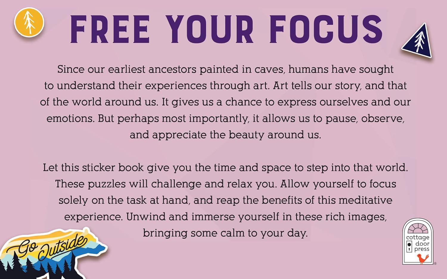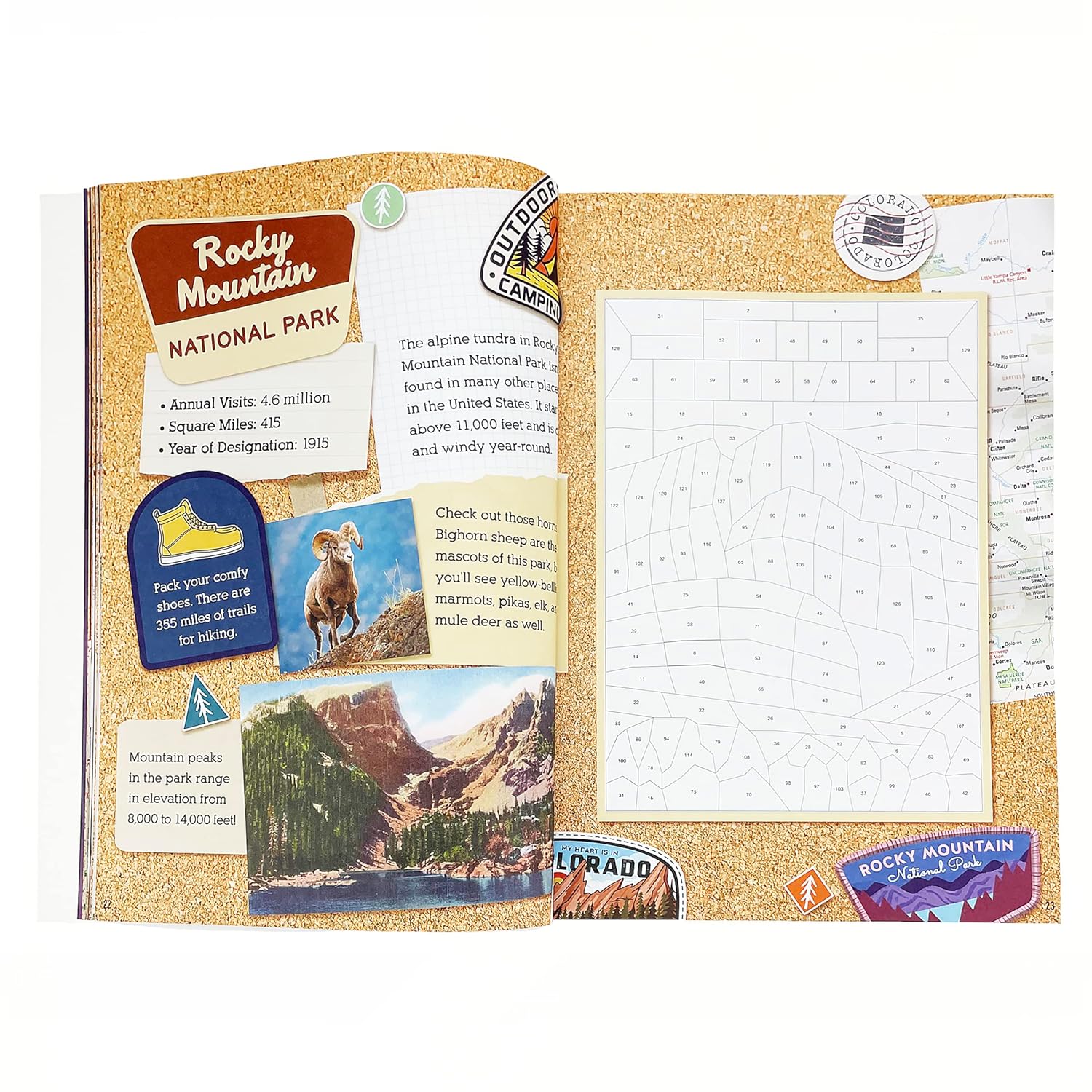 12 STICKER SCENES: Each vibrant sticker scene is inspired by iconic images of the most beautiful National ParksRELAX AND FREE YOUR IMAGINATION: Art tells our story, and that of the world around us. It gives us a chance to express ourselves and our emotions. But most importantly, it allows us to pause, observe, and appreciate the beauty of nature.CHALLENGING AND CALMING: Allow yourself to focus solely on the task at hand, and reap the benefits of this meditative experience. Unwind and immerse yourself in these rich images, bringing some calm to your day.PERFORATED STICKER PAGES: No more hassle with flipping back and forth between your sticker sheet and your puzzle scene. Perforated pages on the sticker sheet allow a seamless experience to pull out the page to complete your activity.