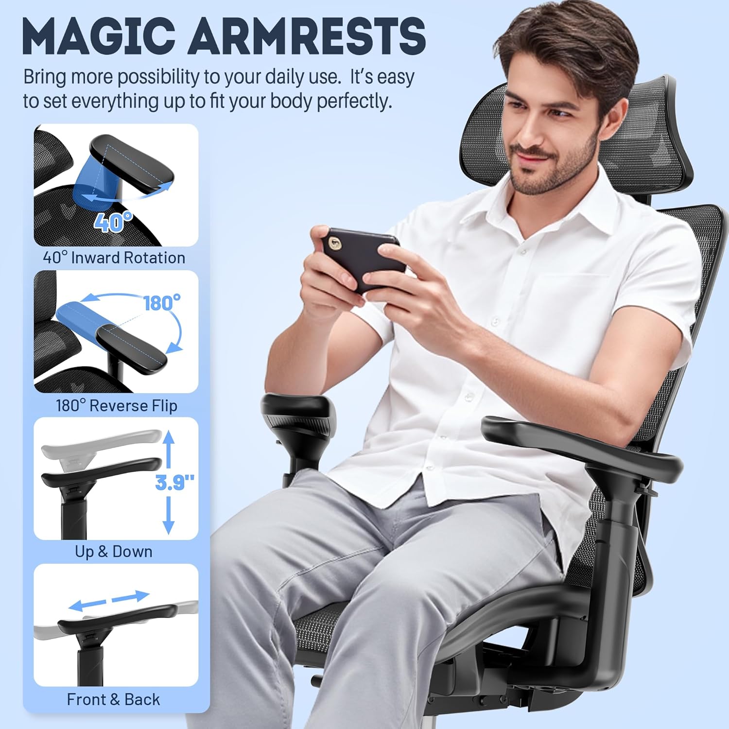 Magic Armrests: Bring more possibility to your daily use. T11 home office chair is equipped with a set of 3-D functional armrests, that can be customized from 0-225°. Not only up-down, and front-back, but also the inward-outward angles are more than 180°.