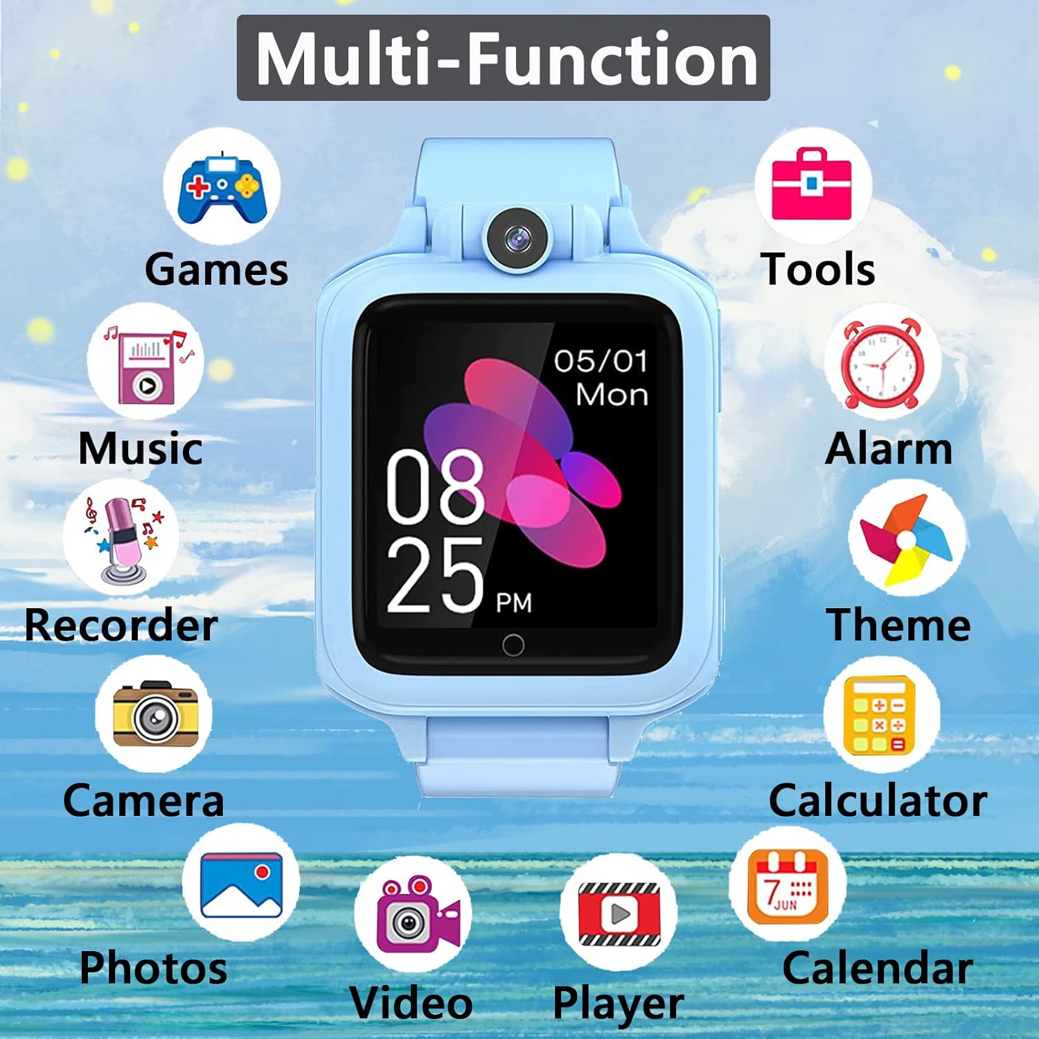 All-in-One Kids Smart Watch: This upgraded smart watch for kids features a built-in camera for photos and videos, MP3 music player, 14 engaging puzzle games, audio/video recorder, alarm clock, calculator, stopwatch, timer, customizable themes, and support for 12 languages. Note: Not waterproof – avoid immersion in water
