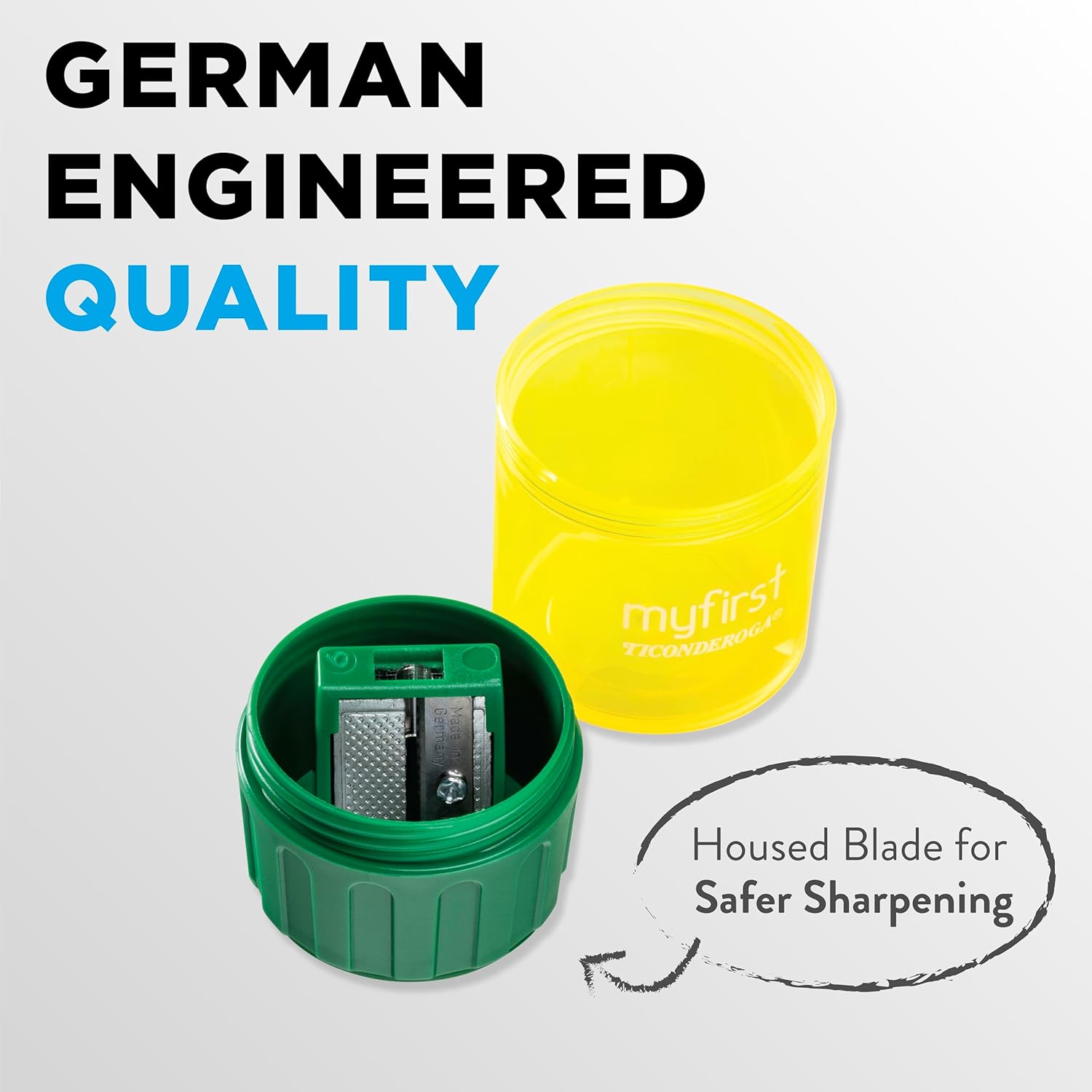 From the brand that brings you the My First World’s Best Pencil, Ticonderoga now offers a My First premium pencil sharpener. Quality-made jumbo-size pencil sharpeners are hard to find, and most are very basic. This My First Ticonderoga hand-held sharpener is specifically designed for jumbo-sized pencils and comes with a large collection area to capture shavings. A screw-top lid also helps keeps the mess inside so your child can stay focused on learning!
