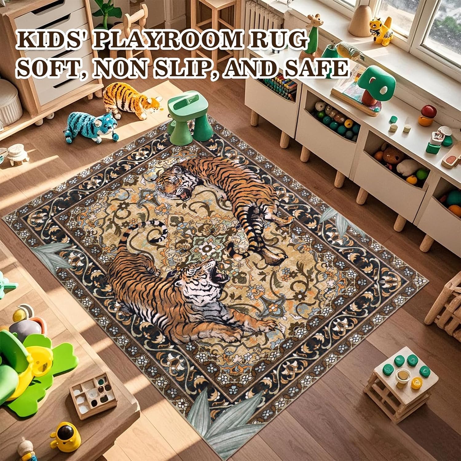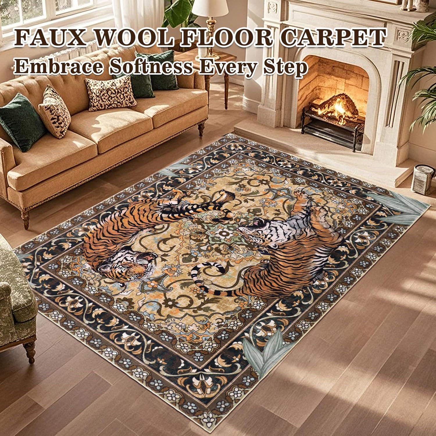 DURABLE&TOUCH FRIENDLY: Crafted from premium faux wool, our tiger living room rug combines softness with durability. It’s designed to be non shed, kid and pet-friendly, keeps your bare feet feeling like stepping on clouds while withstanding daily wear and tear