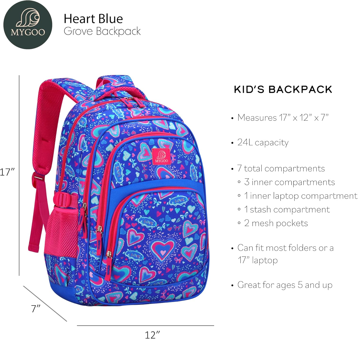Optimal Size: Dimensions of 17” x 12” x 7” and a 24L capacity cater to school needs