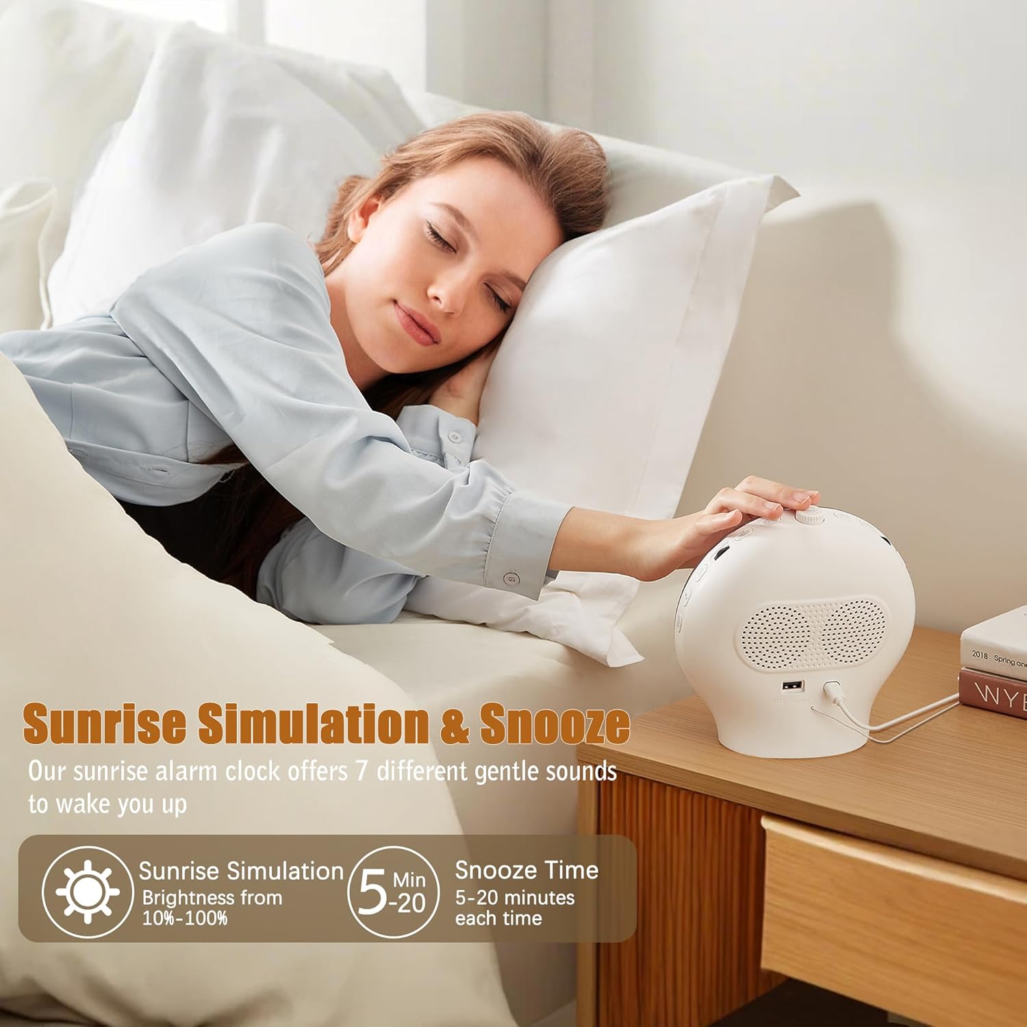 Sunrise Simulation & Snooze: Set the sunrise clock light to wake you up 0/10/60 minutes before the sun alarm clock sounds. The simulated sunrise light increases from 10% to 100% brightness over the set time. Our daylight alarm clock offers 7 different gentle sounds to wake you up, press the snooze button to help you gradually wake up, reduce sleep inertia and improve cognition.