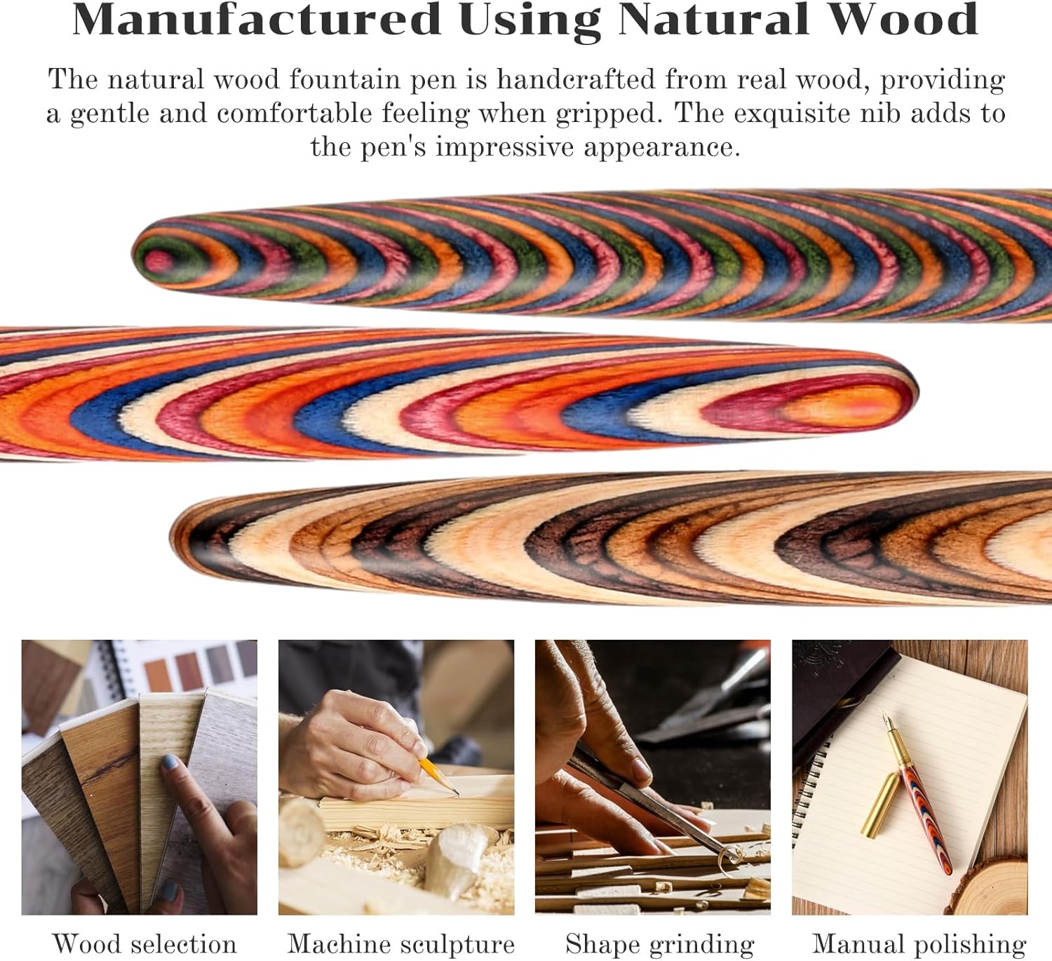 【Handcrafted Wood Fountain Pen】Our wooden fountain pens are all handcrafted with meticulous craftsmanship, including solid brass nibs, and exquisite glazed wood texture which brings intricate and beautiful patterns that look like an amazing rainbow that is eye-catching when writing. Our fountain pens bring a retro sensibility to the art of fine writing.