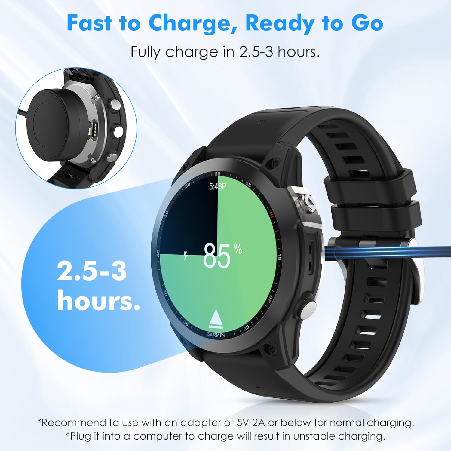 COMPATIBILITY – This charger is compatible with the Garmin Fenix E/8/7/7 Pro/7S/7S Pro/7X/7X Pro/6/6X/6S/5/5 Plus/5X/5X Plus/5S/5S Plus/Instinct/Instinct 2/2S/2X/Tactical/EPIX 2/Pro/Pro Gen 2/Venu/Venu 2 Plus/2/2S/3/3S/SQ2/SQ/SQ2 Music/SQ Music/Vivomove 4/4S/3S/3/3Music/Vivoactive5/Forerunner 965/955/955 Solar/955/945/935/745/645/645M/265/265S/255S/255S Music/255/255 Music/245/245M/45/45S/Approach X10/S60/S62/S70/Tactix Delta/7/Enduro3/2/1/Quatix 5/5 Sapphire/7Pro Smartwatch.