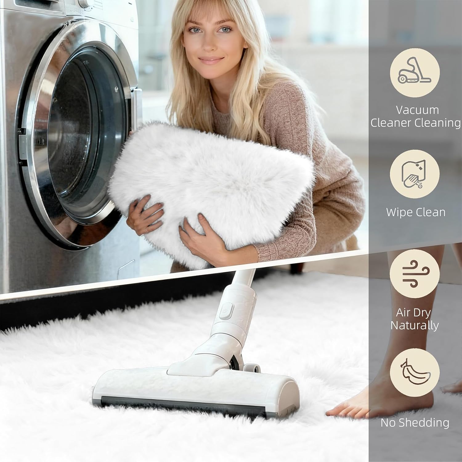 CARE INSTRUCTIONS: Due to vacuum packaging, please allow 1–2 days for the product to regain its fluffy texture. We recommend that you can directly shake off the impurities on the surface of the fluffy rug, or use a vacuum regularly to keep the area rug clean on daily use. For machine washing, use cold water with gentle detergent and air dry. Avoid direct sunlight