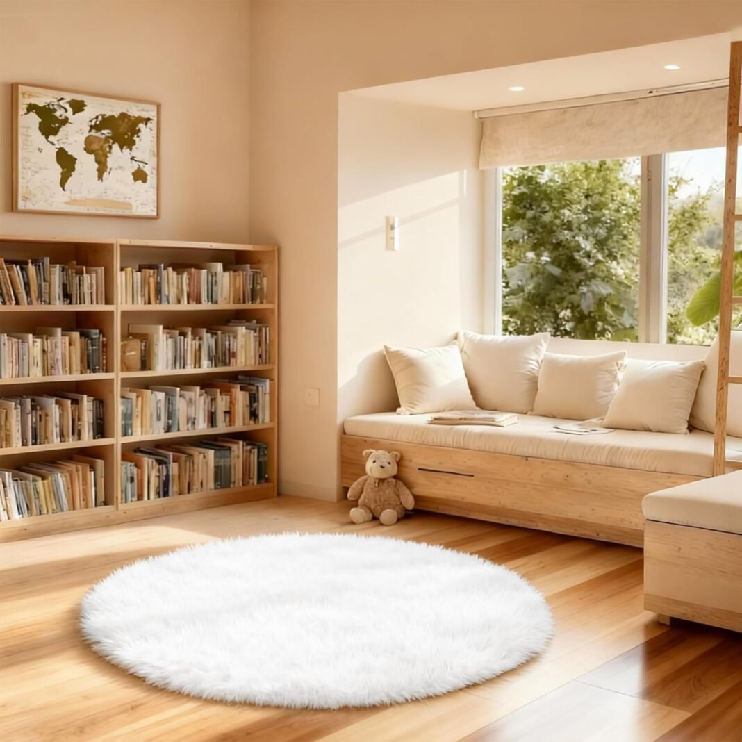 SWGRT White Round Rug, Soft Fluffy 4ft Circle Area Rugs, Shaggy Carpet for Children Kids Girls Room Study, Dorm, Playroom, Office, Non Slip and Non-Shedding, Home Decor Aesthetic