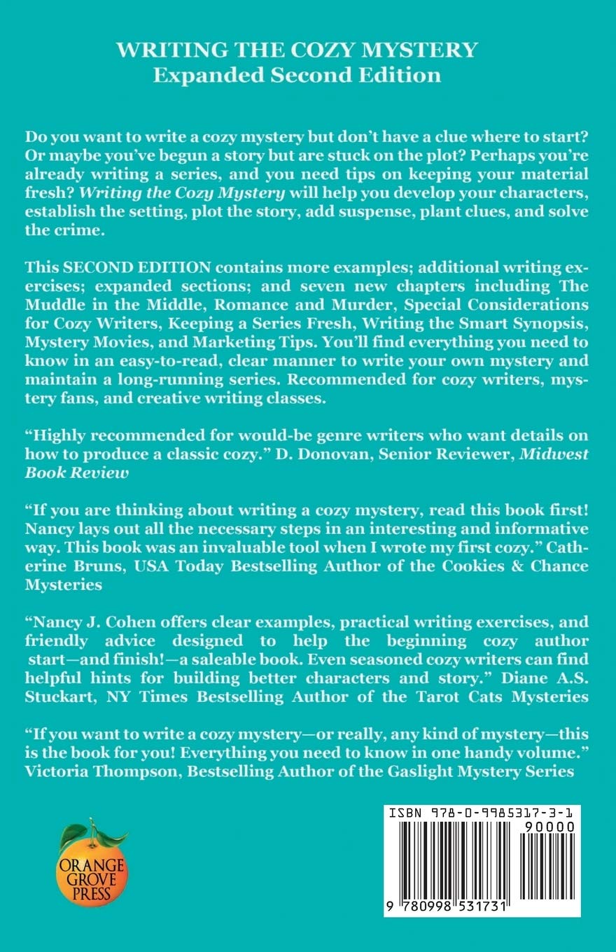 “Nancy J. Cohen offers clear examples, practical writing exercises, and friendly advice designed to help the beginning cozy author start—and finish!—a saleable book. Even seasoned cozy writers can find helpful hints for building better characters and story.” Diane A.S. Stuckart, NY Times Bestselling Author of the Tarot Cats Mysteries